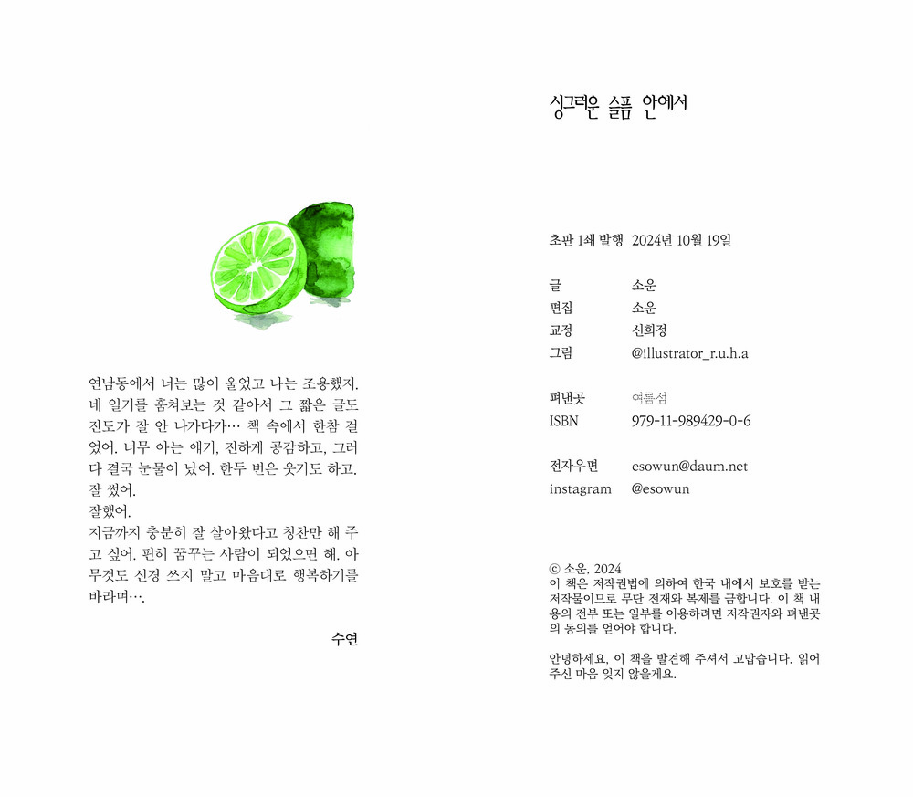 다가오는 감정들을 밀어내지 않고, 그 슬픔조차도 싱그럽게 끌어안고 살아가고 싶다는 다짐.