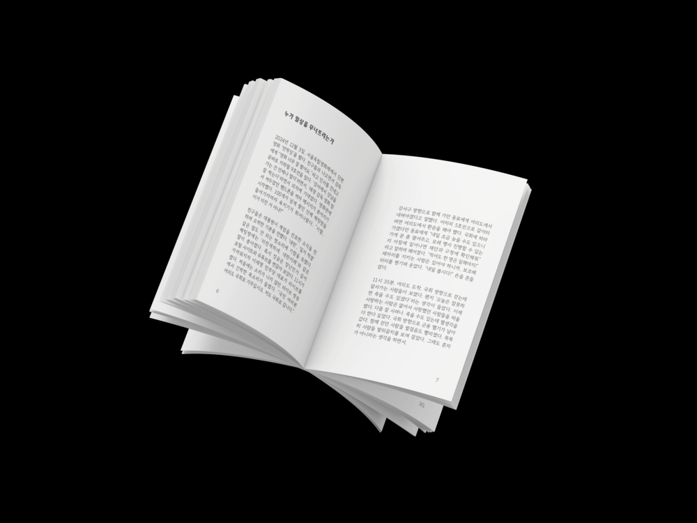 계엄 당일 국회의사당 앞에서 맞닥뜨린 순간부터 여의도와 광화문에서 틈틈이 써둔 생각들… 작가는 비상식적인 상황 속에서 마주한 순간들을 섬세한 문장으로 써내려갔습니다.