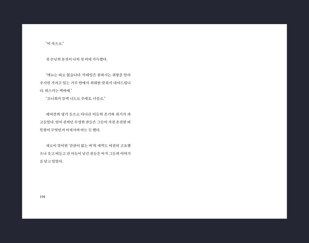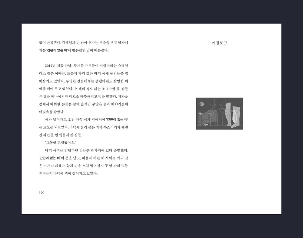은은한 대화들이 차가운 공허를 희석시킨다. 소설처럼, 사람들은 간판이 없는 바로 모인다.