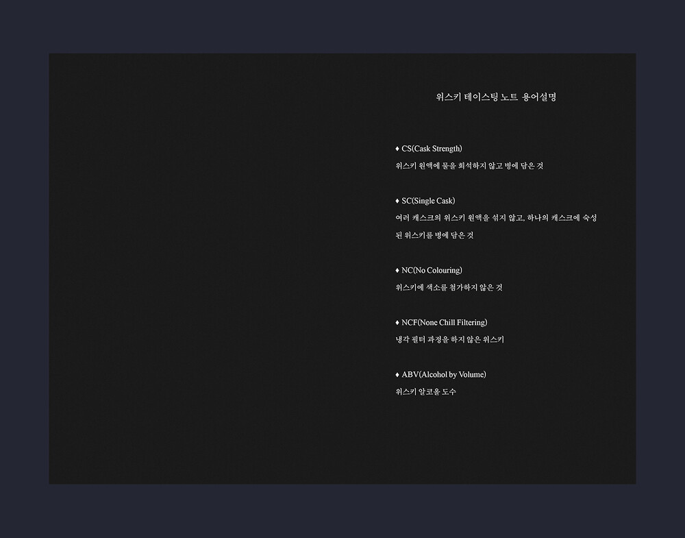 위스키의 맛과 향을 자유롭게 상상하게 됩니다.