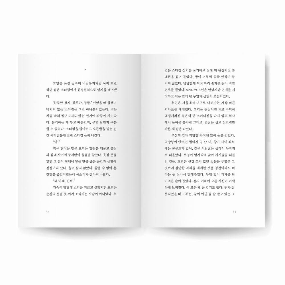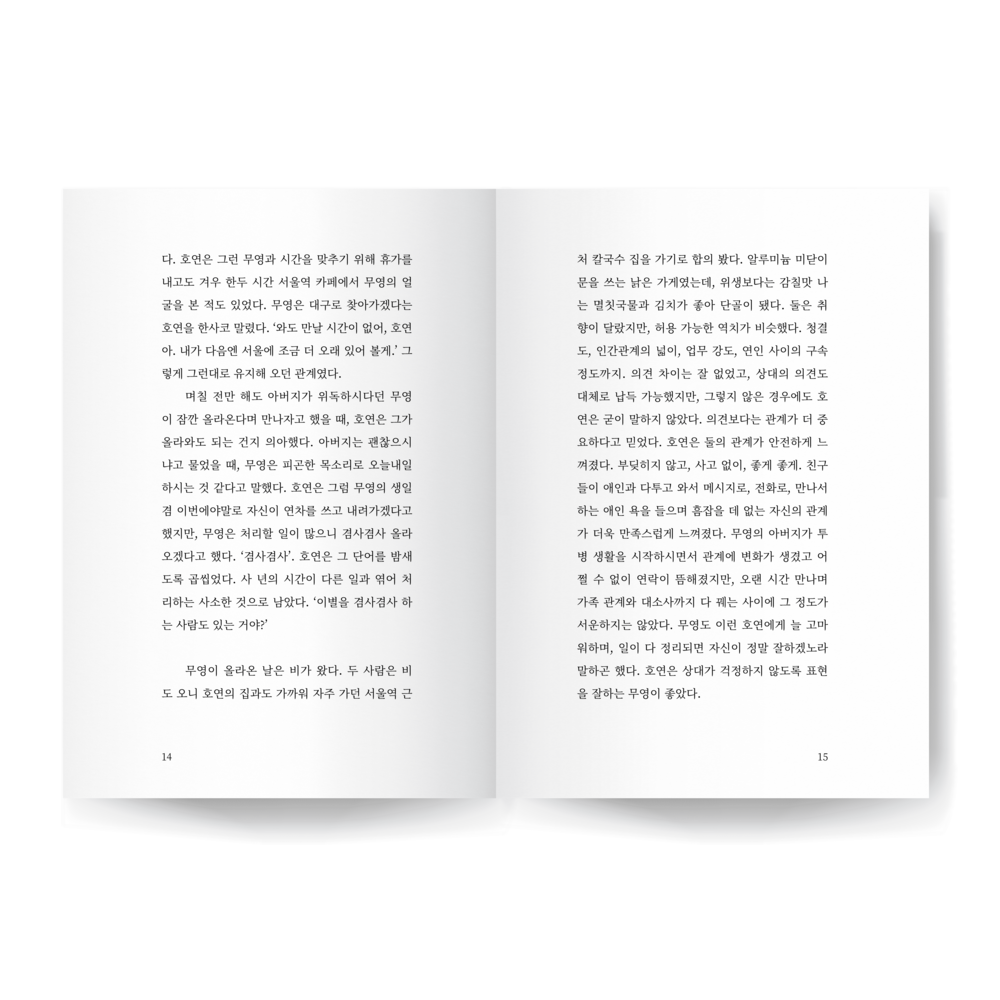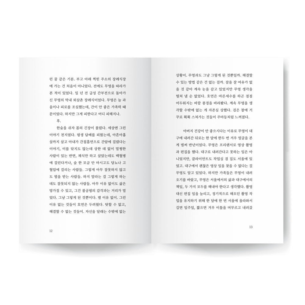 호연아. 호연아. 호연은 이름이 자신을 배신하고 찌르는 느낌을 받았다. 무영은 항상 호연의 이름을 불렀다. 굳이 이름을 붙이지 않아도 할 수 있는 모든 말에, 호연의 이름은 문장의 맨 앞에 불리기도 하고, 문장 끝에 덧붙이듯 불리기도 했다. 그게 갑자기 생경하게 느껴졌다. 호연은 무영의 이름을 잘 부르지 않았다. 이름을 부르지 않아도 하고 싶은 말을 할 수 있으니까. 수신자는 어차피 무영뿐이니까. 마시다 만 아메리카노 표면에 기름이 떠 있었다. 속이 메스꺼웠다. 아무 말도 않고 바로 앞의 커피잔만 바라보는 호연에게 무영은 덧붙였다. 아마 무영은 고개를 약간 오른쪽으로 꺾어 자신을 바라보지 않는 호연의 안색을 살피고 있을 것이다.