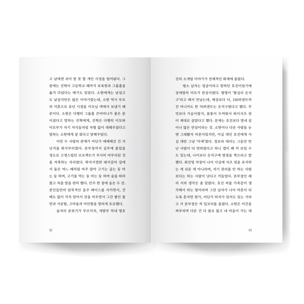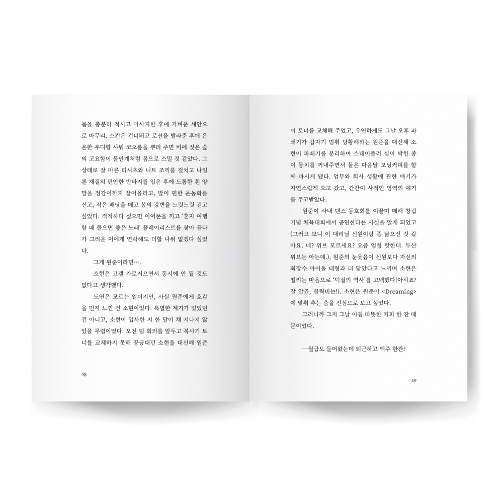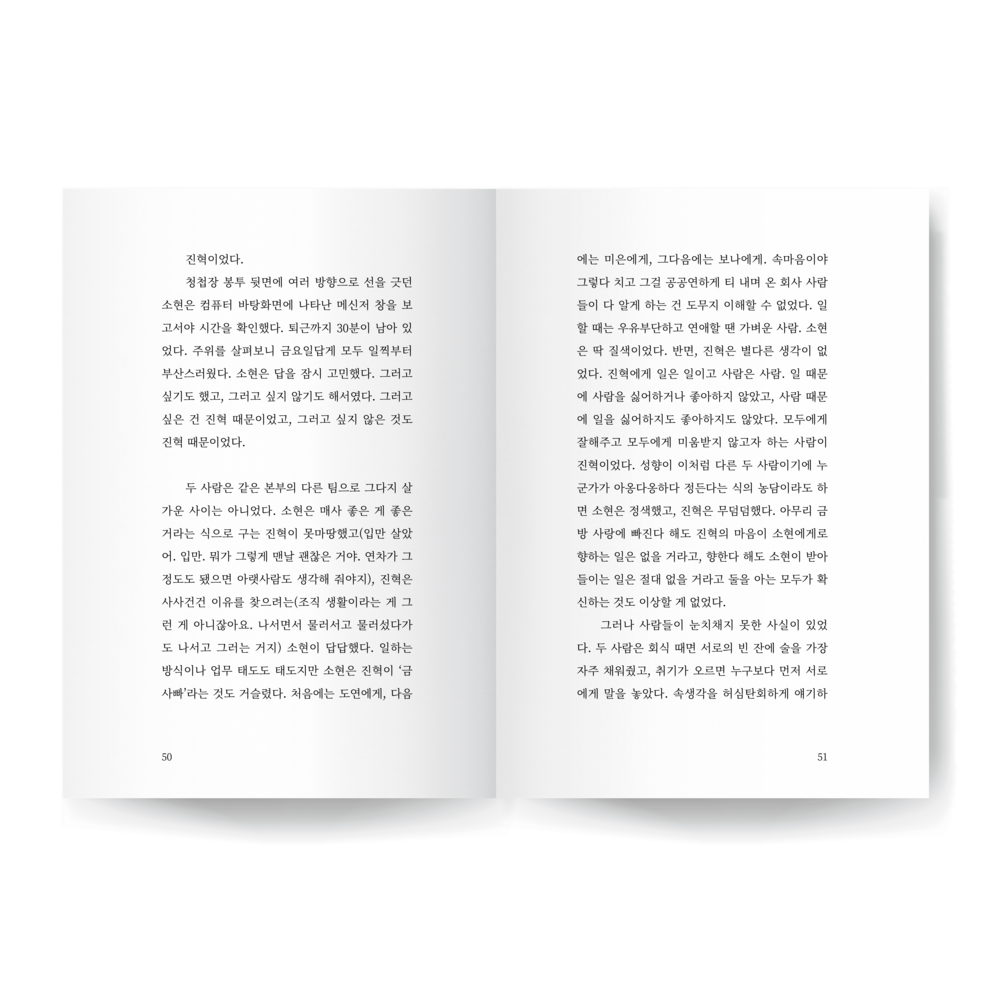 소현은 진혁의 표정을 살폈다. 혼자 하는 사랑도 나쁘지 않았다고, 자기 스스로 순애보라 일컫는 진혁의 이야기 속에는 어느 한 계절이 선명하게 자리하고 있었다. 벚꽃이 짧게 피고 지는 계절, 봄이. 한 사람을 좋아하면서도 늘 겨울 눈보라 속에 서 있는 것 같은 자신과는 달리 그 봄날의 온화한 바람이 진혁을 부드럽게 감싸고 있는 것 같았다. 취기로 붉어진 진혁의 두 뺨이 별안간 예뻐 보였다. 소현은 고개를 절레절레 흔들며 술을 그만 마시고 집으로 가야겠다고 마음먹었다. 주섬주섬 짐을 챙겼다. 진혁은 ‘진짜 이야기는 지금부터 시작인데’ 하는 아쉬운 얼굴로 소현에게 애잔한 눈빛을 보냈다. 후― 소현은 깊은 한숨을 내쉬었다. 그 눈빛의 의미를 단번에 알 수 있었다. 자신도 그런 눈빛으로 한 사람을 바란 적이 있기 때문이었다. 소현은 자기 자신조차 말릴 새 없이 진혁에게 속삭였다.
