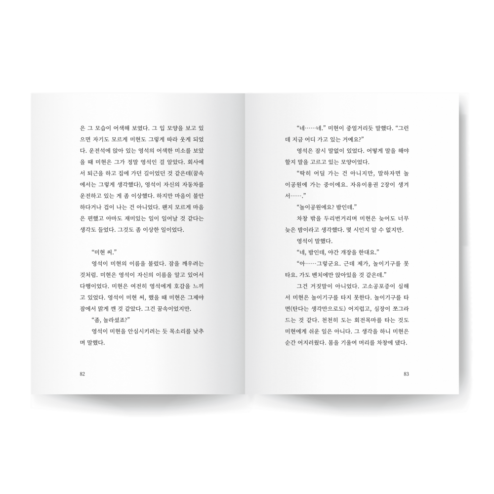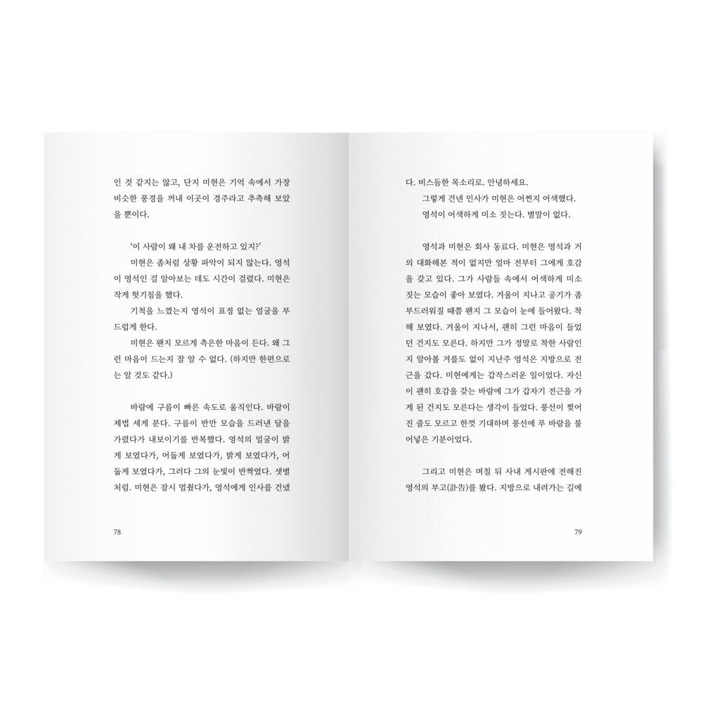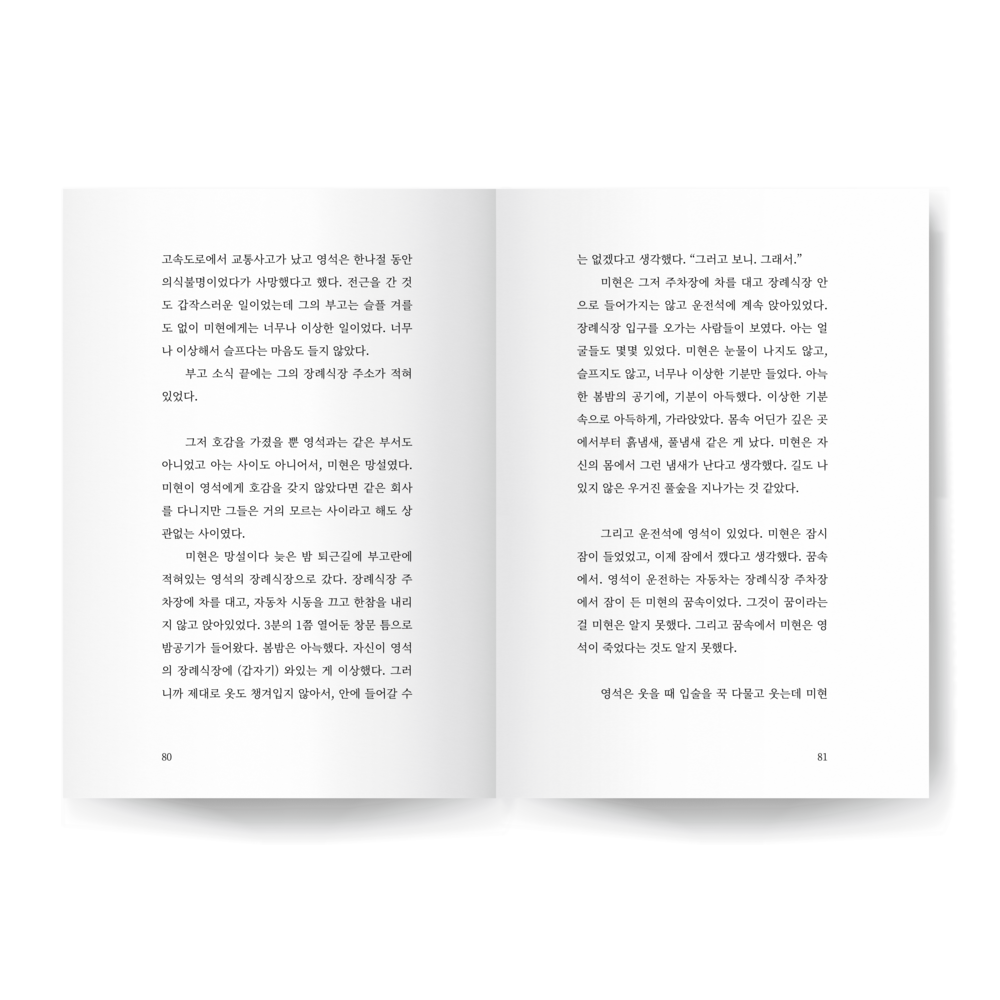 영석이 미현의 이름을 불렀다. 잠을 깨우려는 것처럼. 미현은 영석이 자신의 이름을 알고 있어서 다행이었다. 미현은 여전히 영석에게 호감을 느끼고 있었다. 영석이 미현 씨, 했을 때 미현은 그제야 잠에서 맑게 깬 것 같았다. 그건 꿈속이었지만.