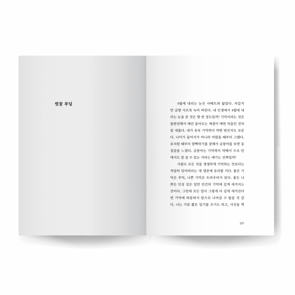 4월에 내리는 눈은 샤베트와 닮았다. 차갑지만 금방 사르륵 녹아 버린다. 내 인생에서 4월에 내리는 눈을 본 것은 몇 번 정도일까? 기억이라는 것은 불완전해서 매년 돌아오는 계절이 매번 처음인 것처럼 새롭다. 내가 유독 기억력이 약한 탓인지도 모른다. 나이가 들어서가 아니라 어렸을 때부터 그랬다. 유치원 때부터 깜빡하기를 잘해서 금붕어를 보면 동질감을 느꼈다. 금붕어는 기억력이 약해서 수조 안에서도 잘 살 수 있는 거라는 얘기는 진짜일까?