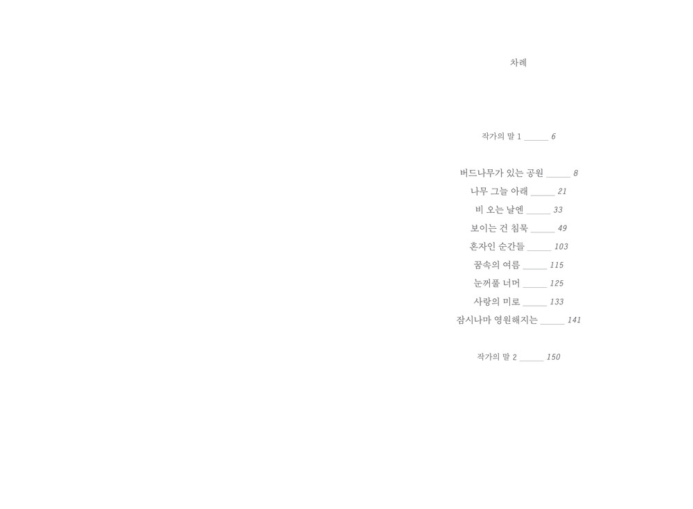 눈을 감아본다. 시간이 멈춘 듯하다. 눈꺼풀 속에서 움직이는 눈의 온기를 느끼는 동안 기억의 배경이 나타난다. 새카만 강가의 반딧불이 한 무리. 천장 너머로 쏟아지는 빗소리. 아득히 멀어지는 발자국 소리.