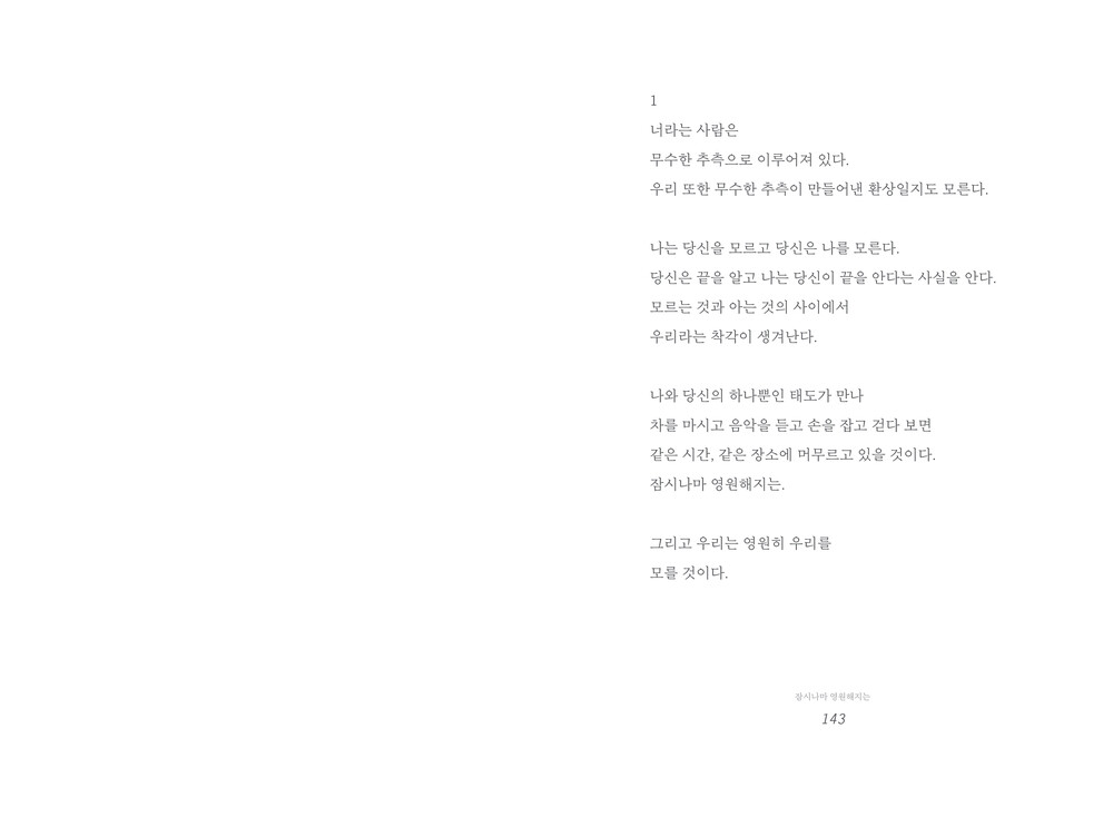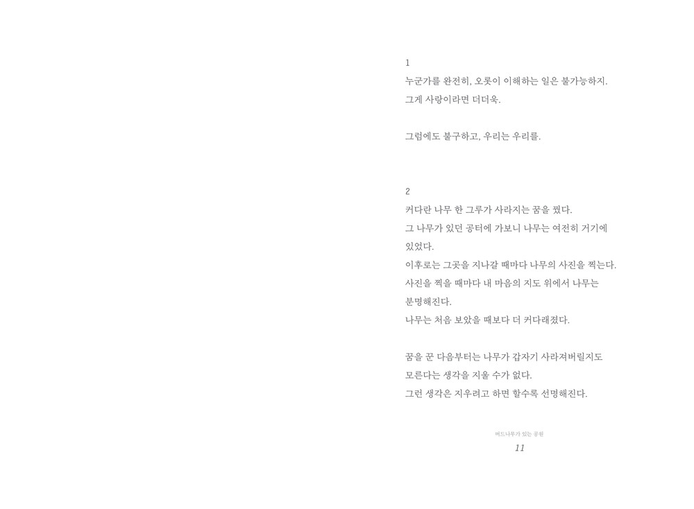 여기서 우리는 시제가 없는 이야기를 나눈다. 말없이, 기억의 공동체로서.