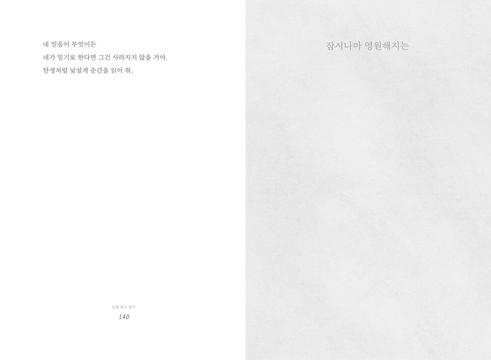 두 눈을 꼭 감은 풍경은 어둠이었다가 이내 밝아져 여러 색을 띠고, 불안의 감각은 곧 믿음의 감각이 됩니다.