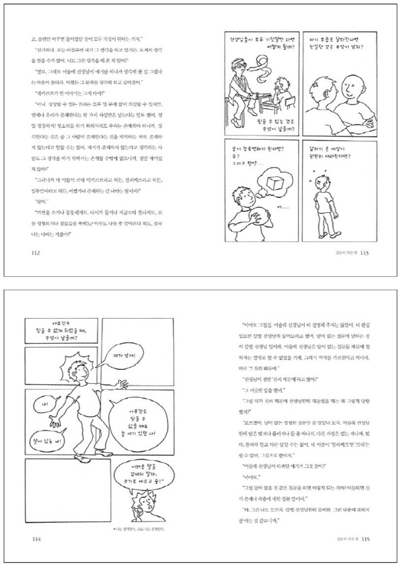 바로 필리베르의 병이 그랬다. 아무리 중요한 생각이라도 무조건 강요하는 것은 절대로 싫었다. 언제나 한편에 상상의 여지가 있기를 바랐다. 웃으면서 진리에 대해 이야기할 수 있기를, 그래서 속지 않았음을 보여줄 수 있기를. 그냥 말하고 싶으니까 진리에 대해 이야기하기를 바라는 것이다. 함께 놀고 싶은 친구처럼 진리를 좋아하니까.