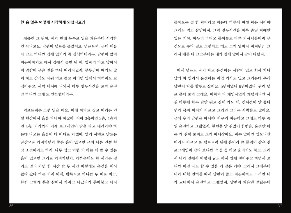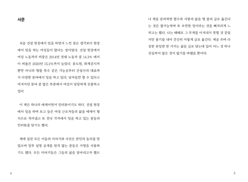 건설 현장에서 일을 하며 보고 들은 여성 근로자들의 삶을 에세이 형식으로 적어냈고