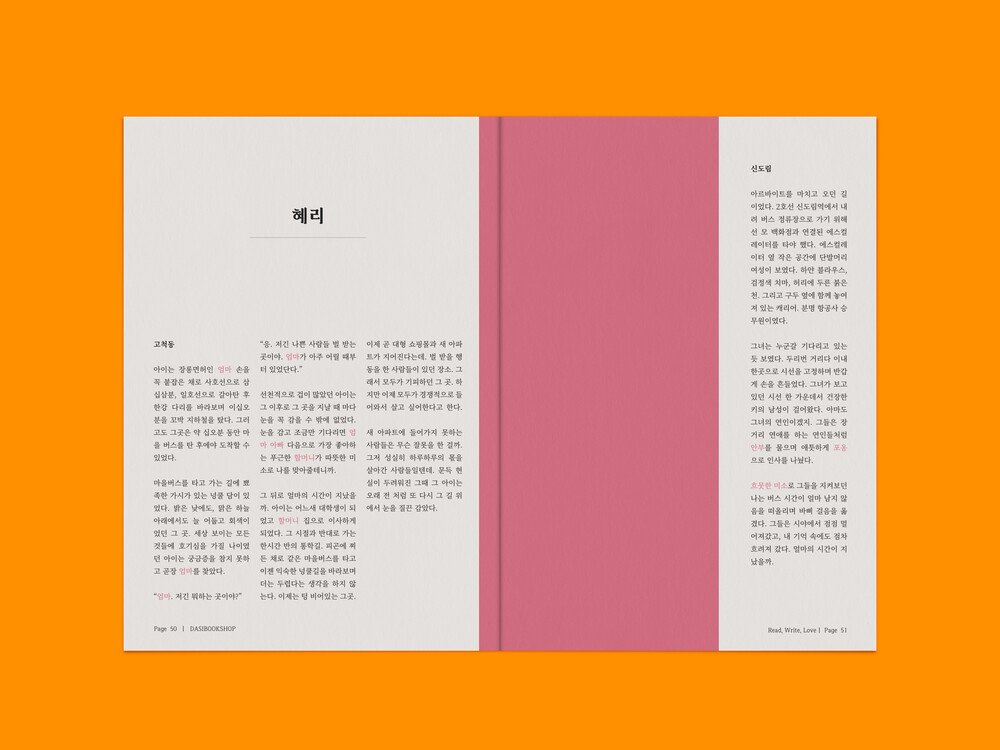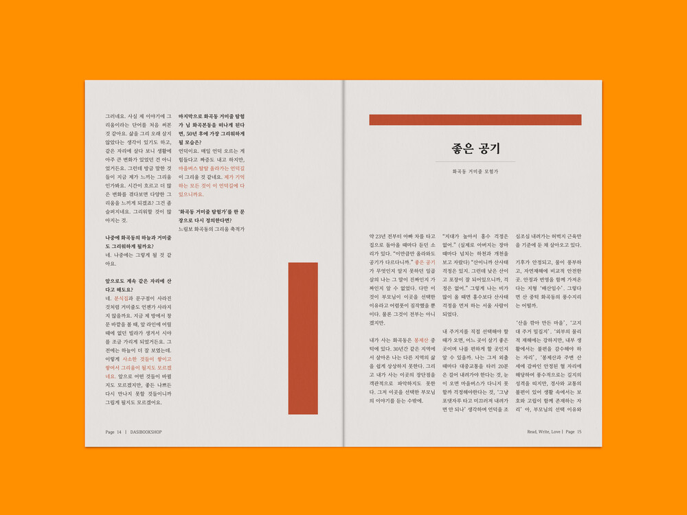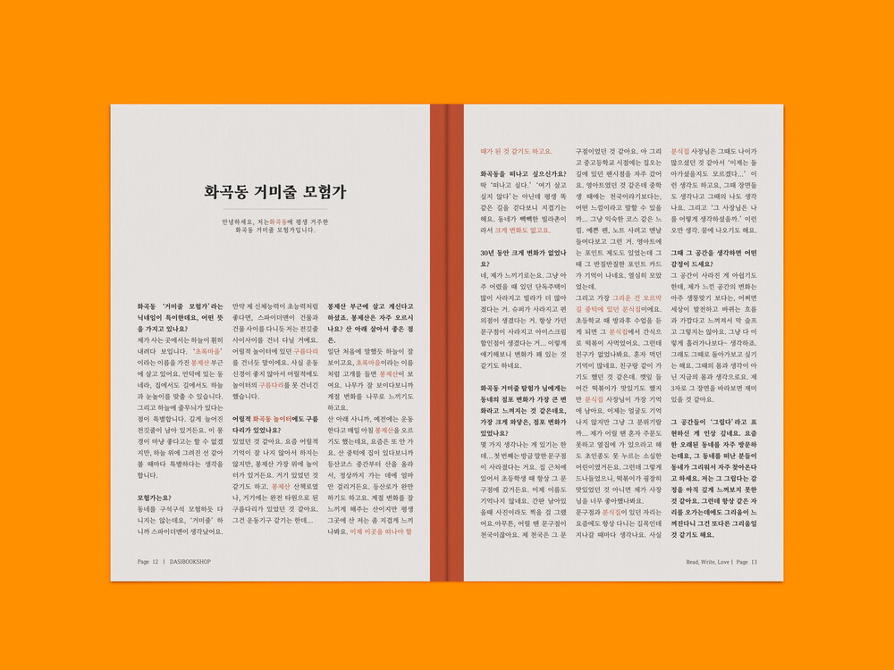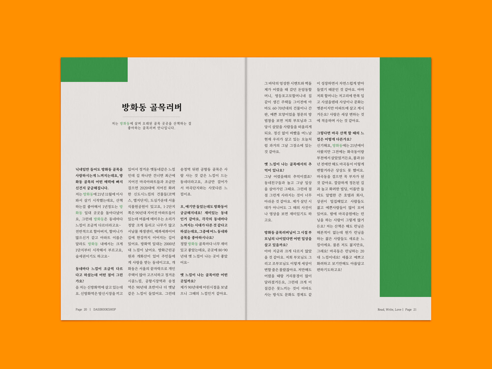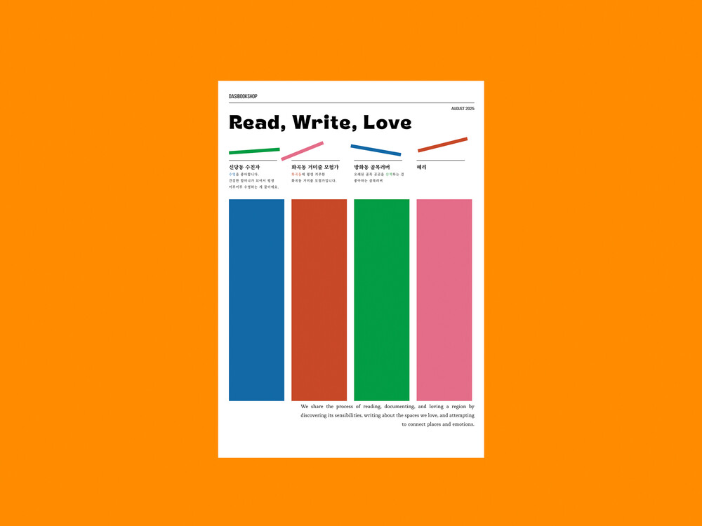 서울형책방을 통해 진행한 '지역을 읽고, 기록하고, 사랑하라' 프로그램 대화집 <Read, Write, Love> 제작하였습니다. 강서구 화곡동과 방화동을 비롯해 중구 신당동과 구로구 고척동 이야기가 담겼습니다. 프로그램이 진행된 한 달 동안 지역의 감각을 발견하고, 자신이 사랑하는 지역의 공간에 대해 쓰며 장소와 감정의 연결을 시도를 통해 지역을 읽고 기록하고 사랑하는 과정을 함께 나누었습니다.