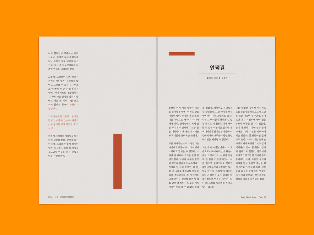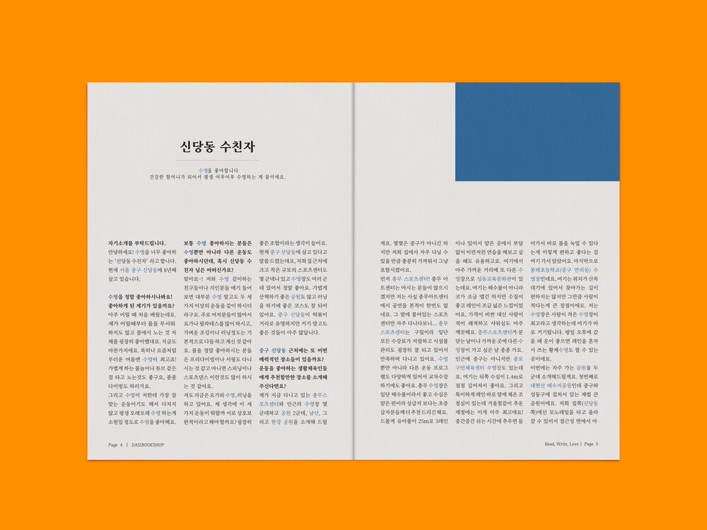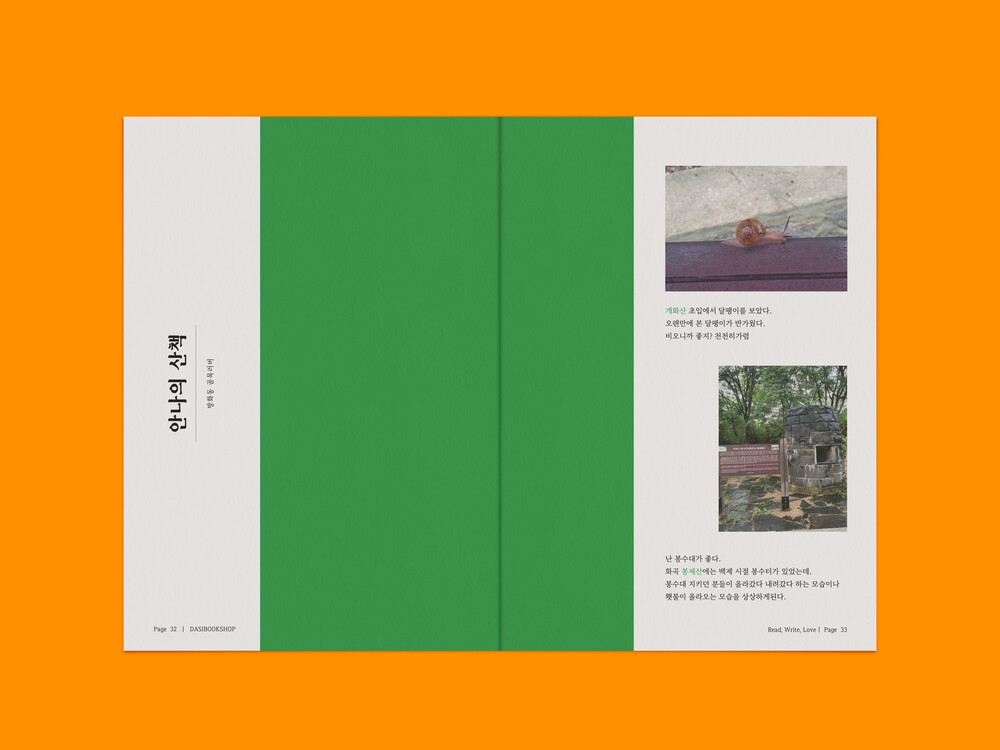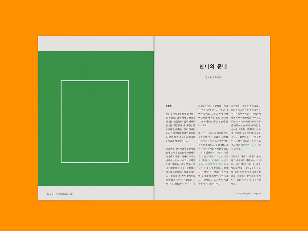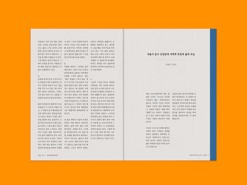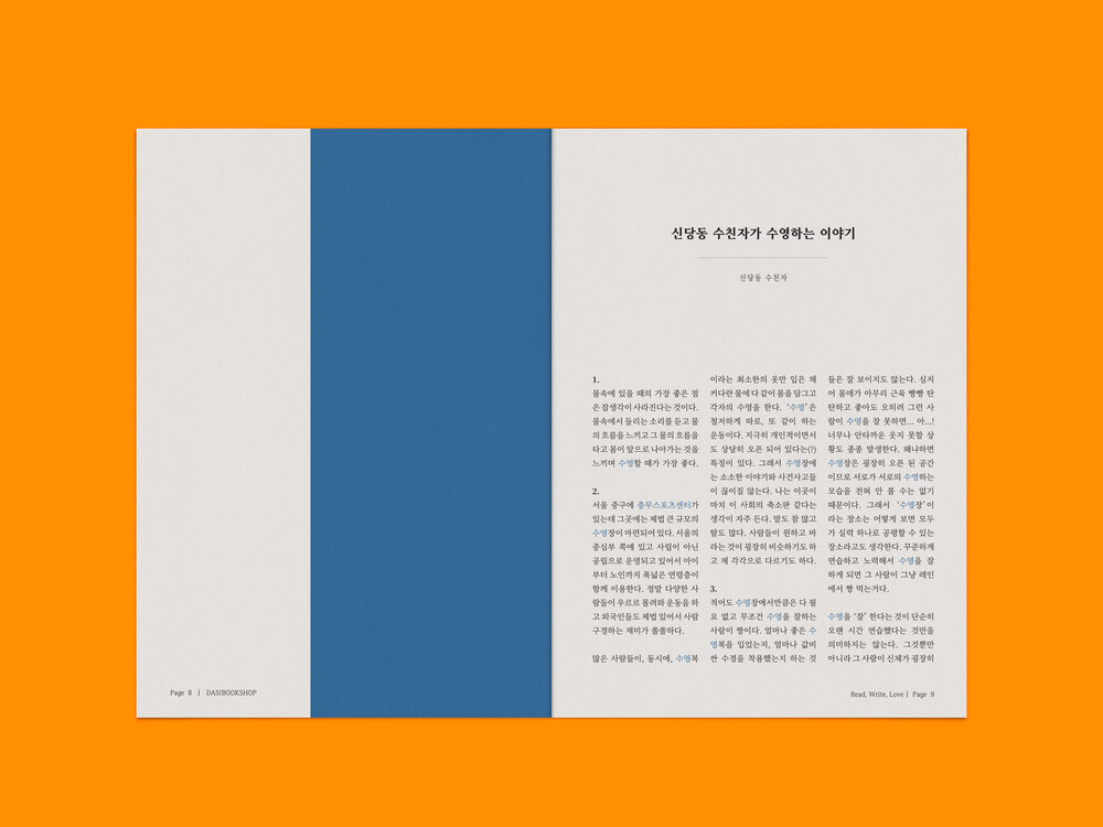 서울형책방을 통해 진행한 '지역을 읽고, 기록하고, 사랑하라' 프로그램 대화집 <Read, Write, Love> 제작하였습니다. 강서구 화곡동과 방화동을 비롯해 중구 신당동과 구로구 고척동 이야기가 담겼습니다. 프로그램이 진행된 한 달 동안 지역의 감각을 발견하고, 자신이 사랑하는 지역의 공간에 대해 쓰며 장소와 감정의 연결을 시도를 통해 지역을 읽고 기록하고 사랑하는 과정을 함께 나누었습니다.