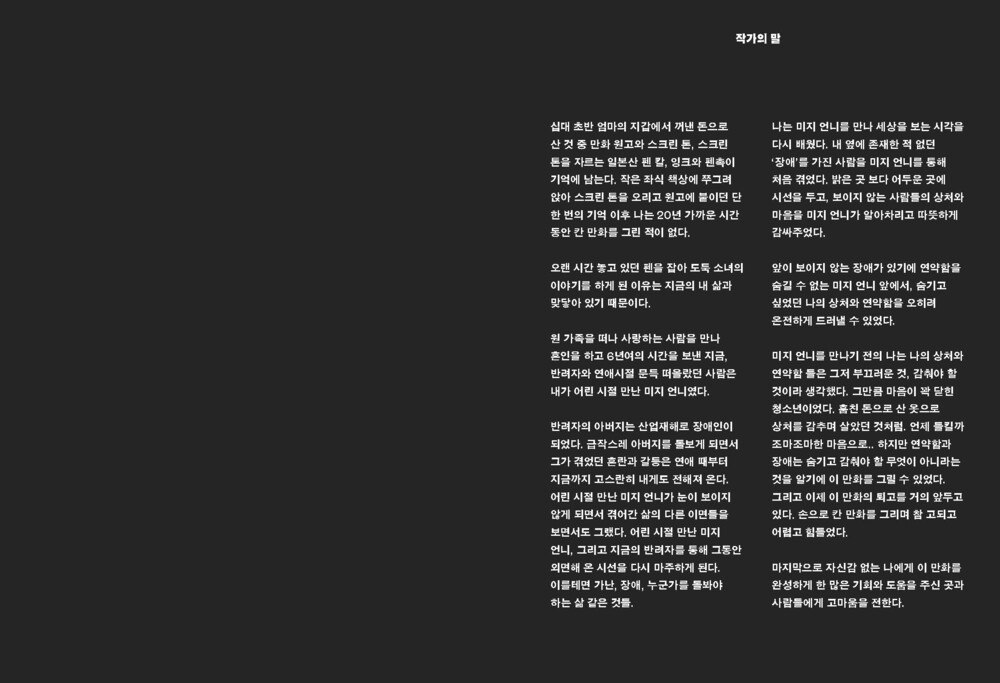 수술 후 한 달 간 병원에 입원해 있는 동안 무료한 병실에서 옆 침상의 언니와 대화를 주고받다 친해진다.