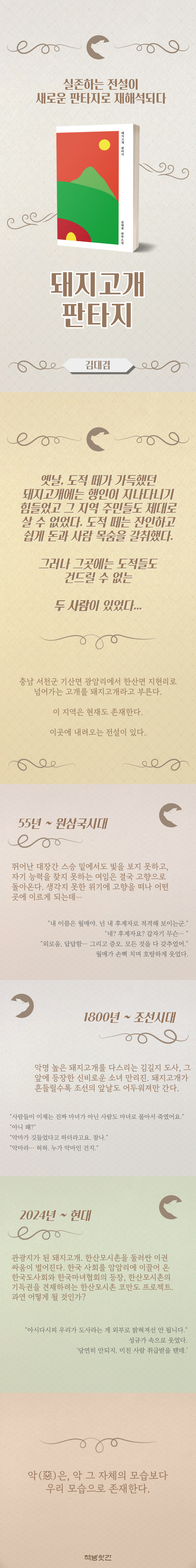 실존하는 지명인 ‘돼지고개’의 전설을 토대로 판타지 소설로 담아낸 김대겸 작가의 첫 소설 『돼지고개 판타지』가 책방앗간에서 출간되었다. ‘도적골’이라고도 불리는 돼지고개를 배경으로 원삼국시대, 조선시대, 현대에 이르기까지 다양한 시대를 넘나드는 이야기를 그린다.