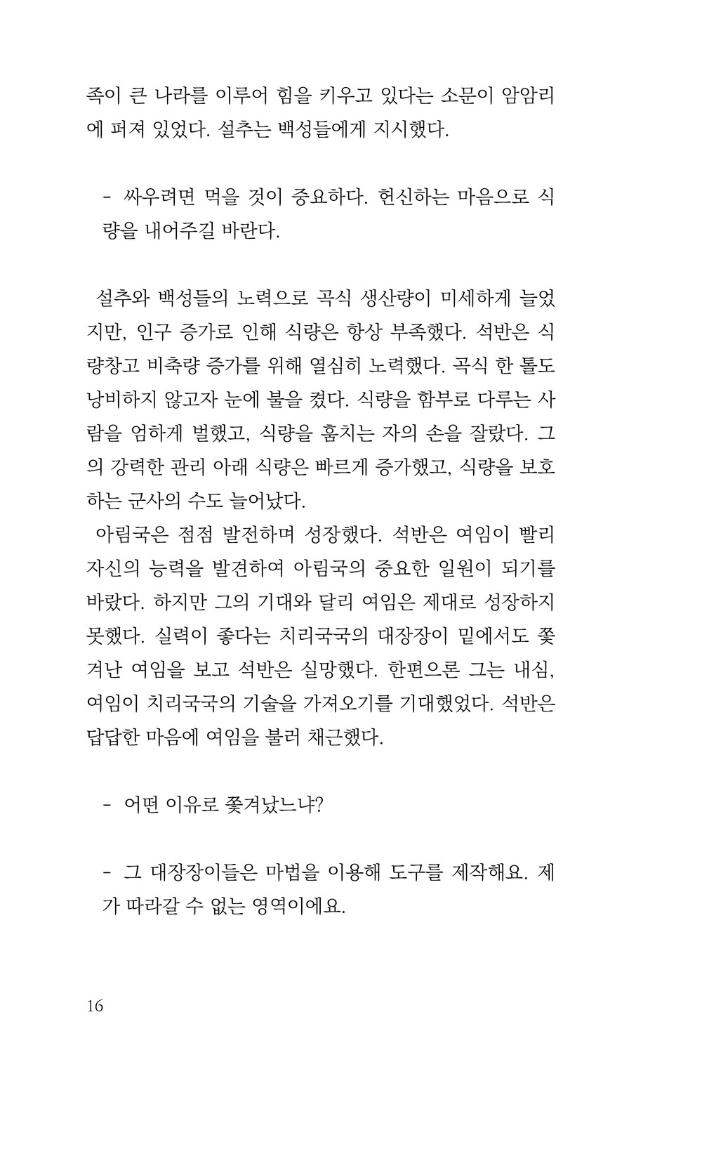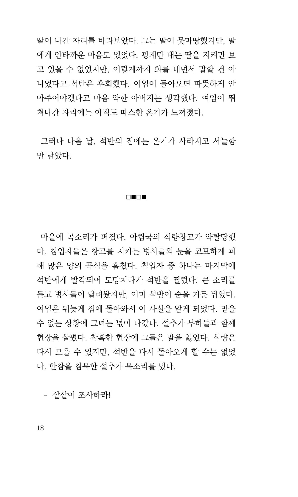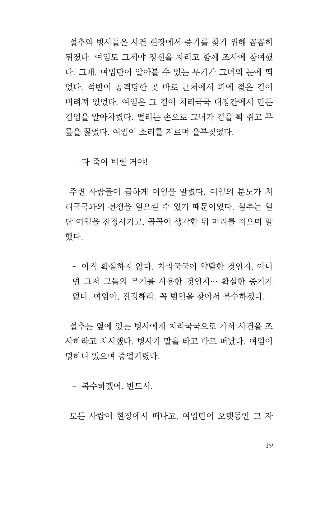 길지가 기쁘게 잔을 받았다. 처음 만난 사람들이었지만 소곡주의 알딸딸함은 그들을 친구로 만들어 주었다. 리진도 잔을 받고 싶었지만, 어린이에게는 쉽게 허락되지 않았다. 65p