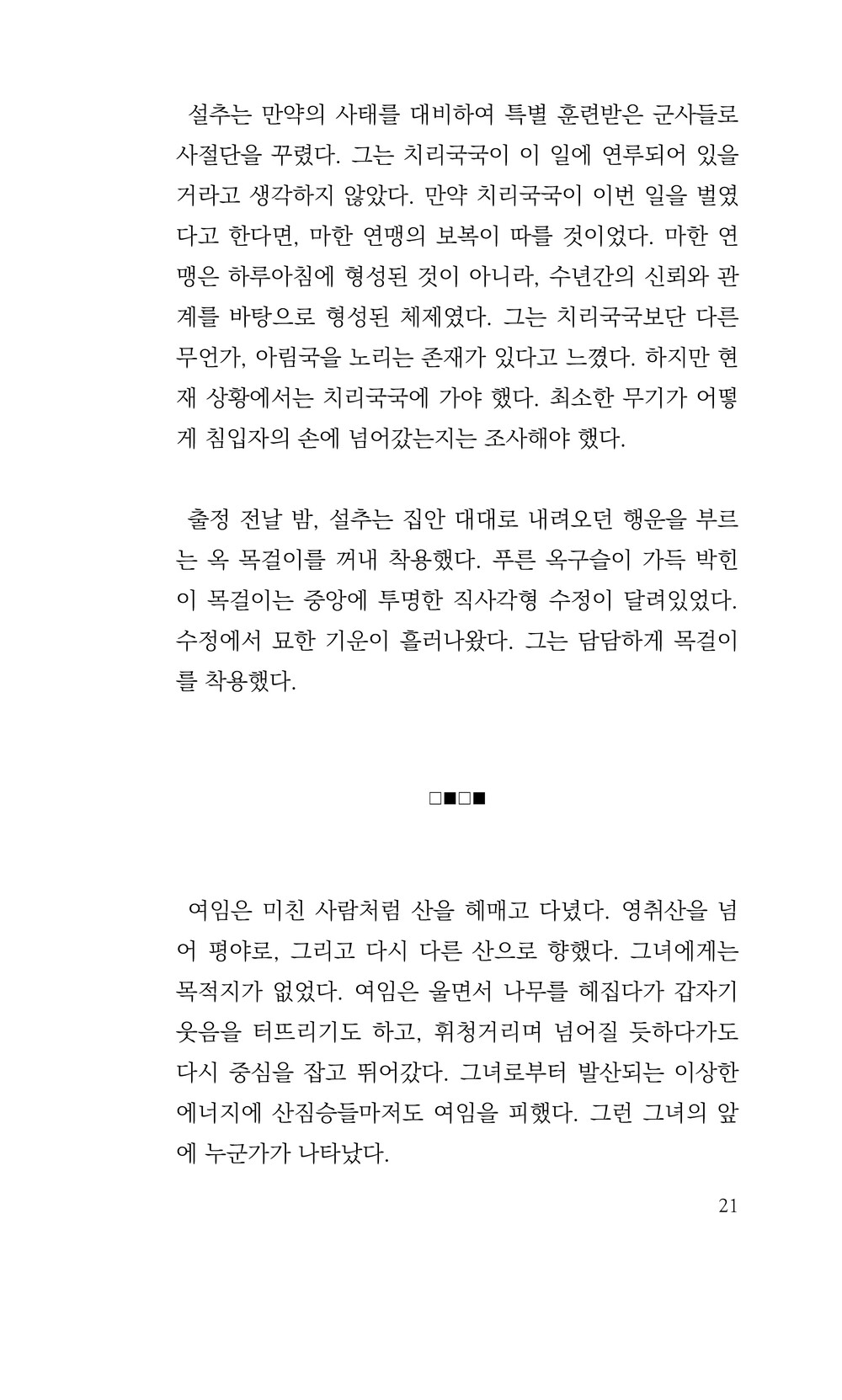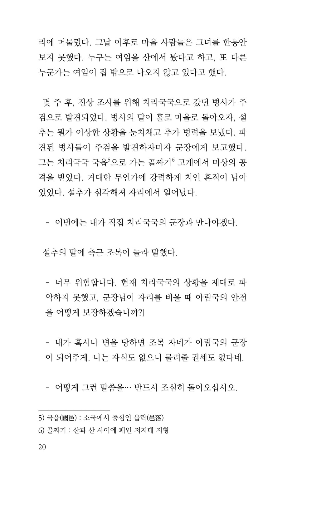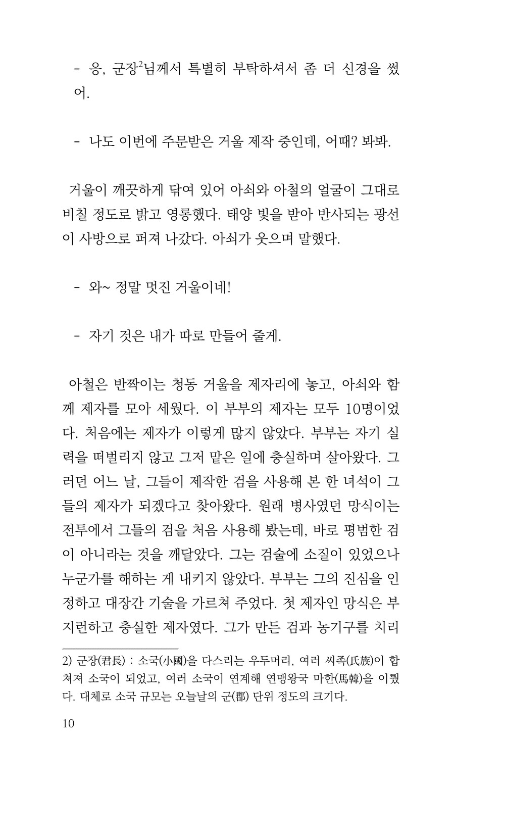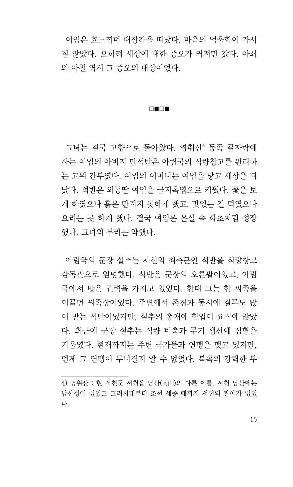 길지가 기쁘게 잔을 받았다. 처음 만난 사람들이었지만 소곡주의 알딸딸함은 그들을 친구로 만들어 주었다. 리진도 잔을 받고 싶었지만, 어린이에게는 쉽게 허락되지 않았다. 65p