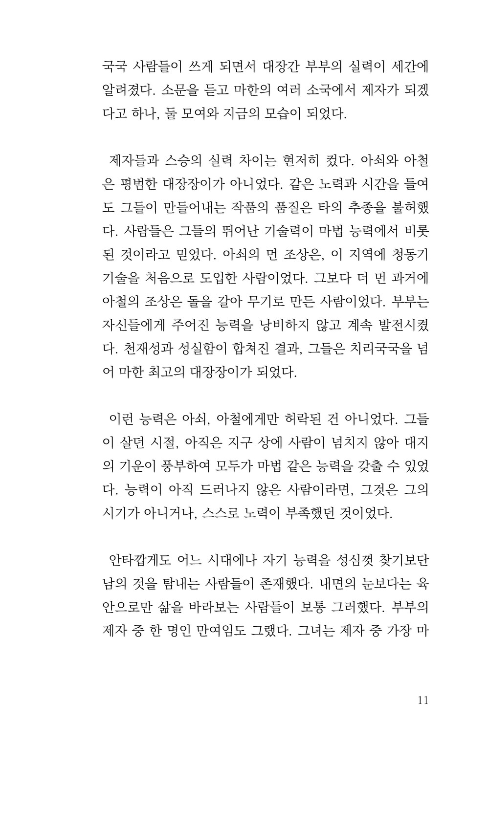 안타깝게도 어느 시대에나 자기 능력을 성심껏 찾기보단 남의 것을 탐내는 사람들이 존재했다. 내면의 눈보다는 육안으로만 삶을 바라보는 사람들이 보통 그러했다. 11p