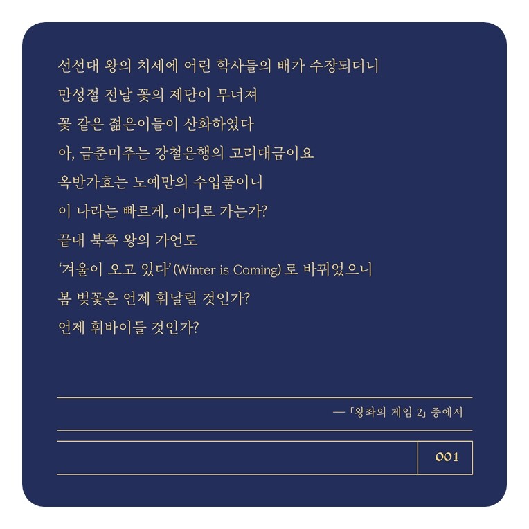 서쪽 대륙의 지배자는 시(Xi) 가문이다 표의문자를 쓰는 나라답게 단음절로 말하길 좋아하며, 문장은 쿵푸를 하는 팬더이다 여러 유목민족에게 지배를 받았으나 이를 머릿수로 극복해 마침내 그들 전부를 백성으로 삼았다 장사에 능하여 허리띠만 졸라매면 어디든 판로를 개척할 수 있다 하여 가언이 '허리띠 하나에 길 하나(One belt, one road)'이다 ━「왕좌의 게임 1」 중에서