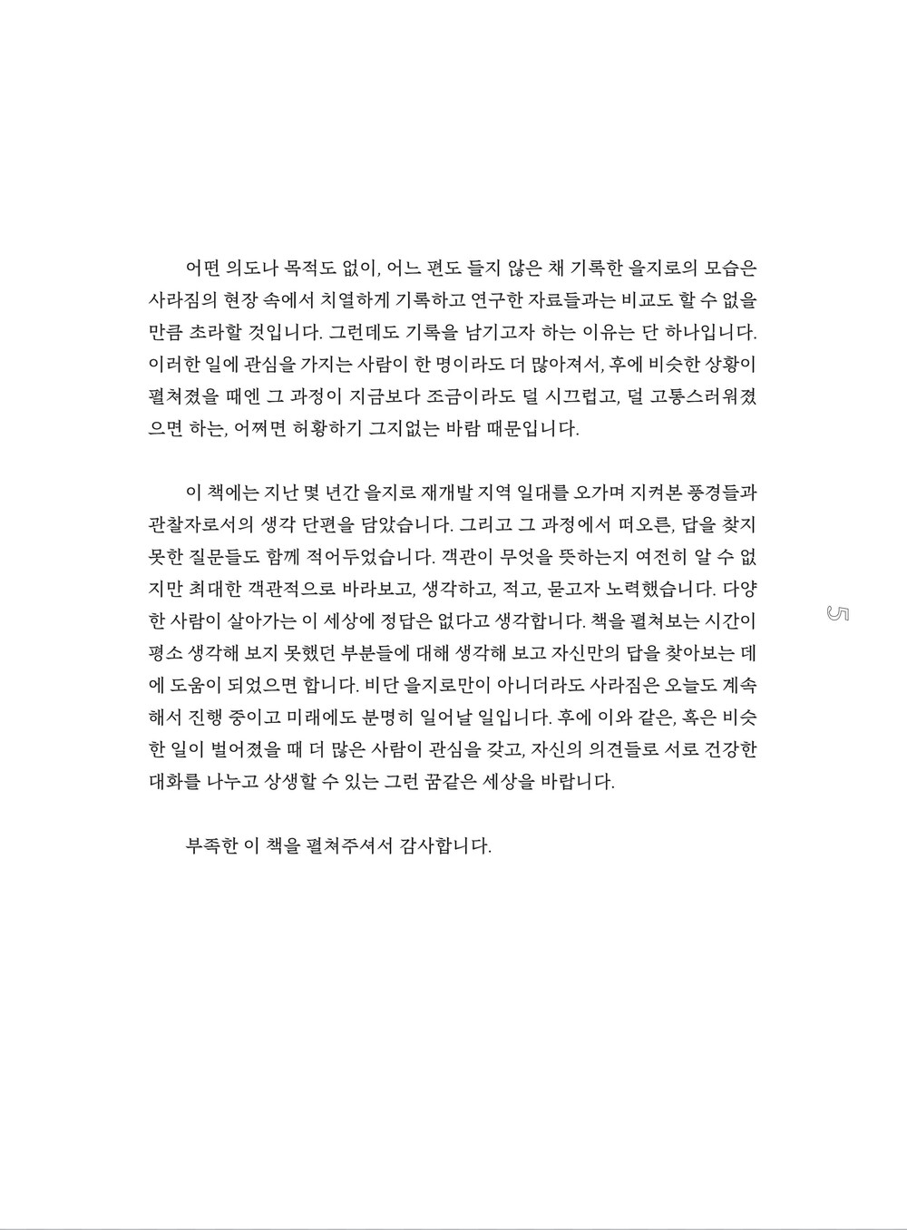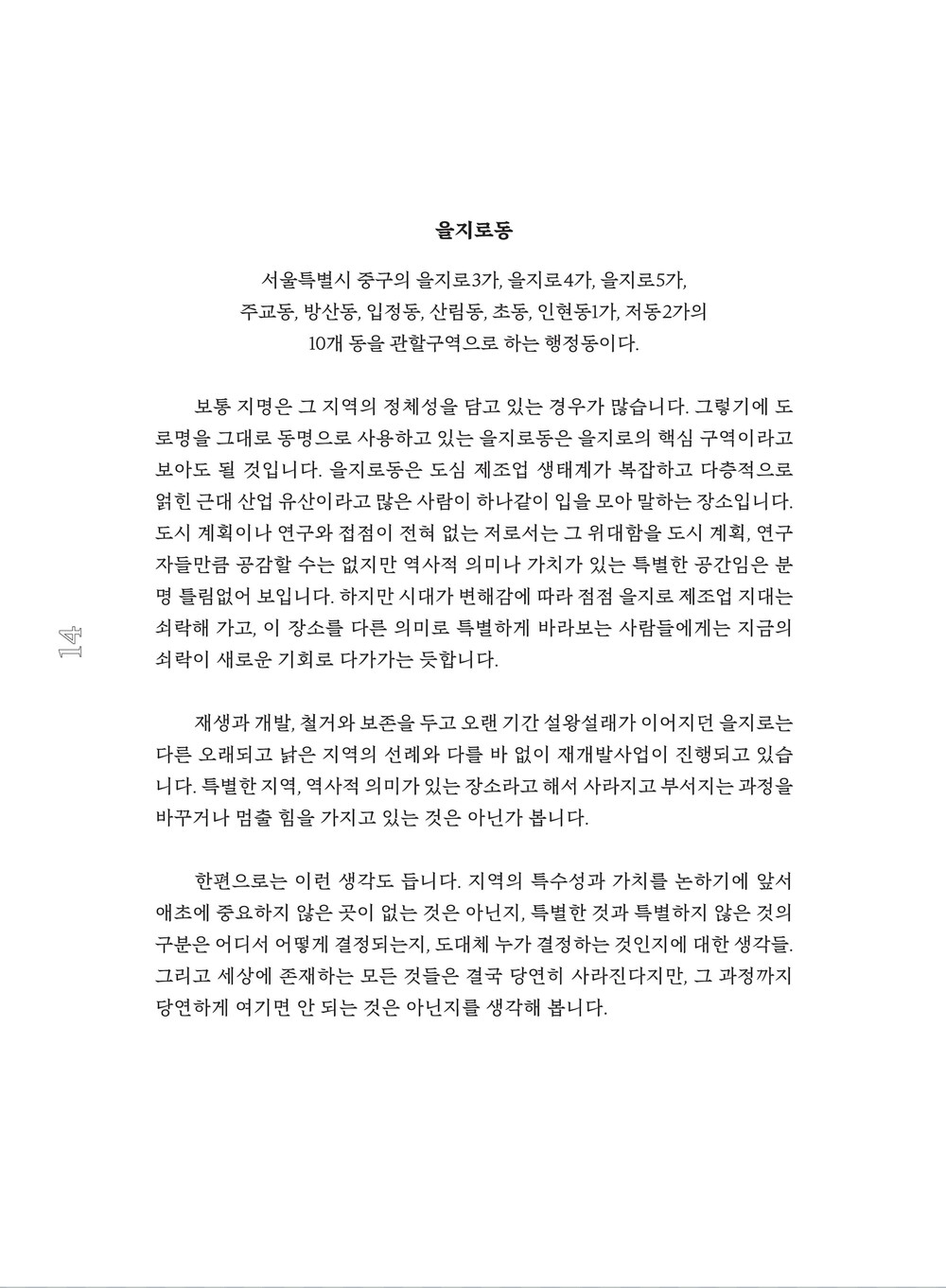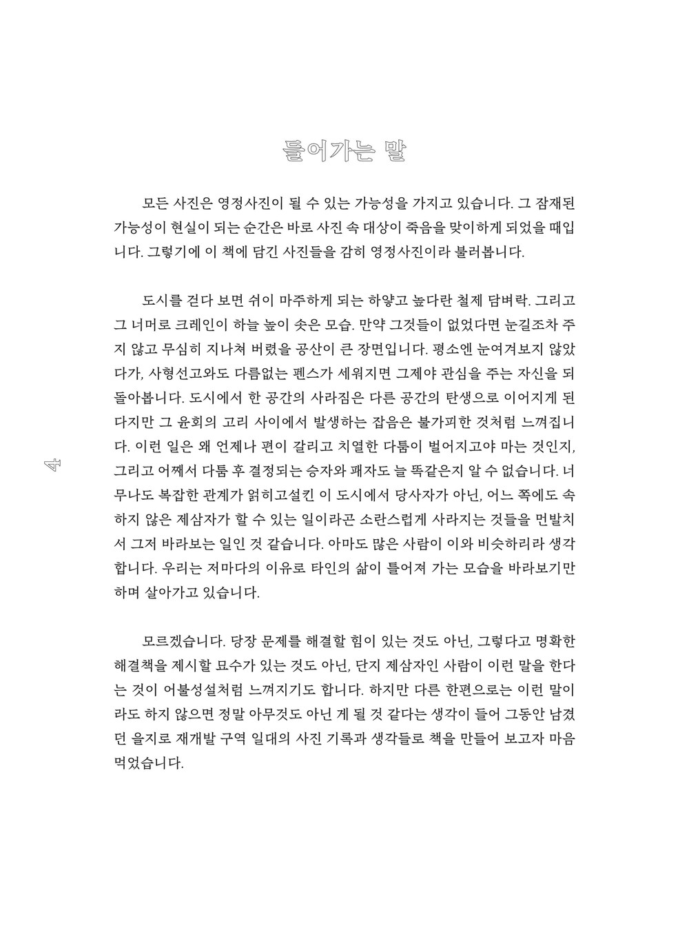 이 책에는 지난 몇 년간 을지로 재개발 지역 일대를 오가며 지켜본 풍경들과 관찰자로서의 생각 단편을 담았습니다. 그리고 그 과정에서 떠오른, 답을 찾지 못한 질문들도 함께 적어두었습니다.