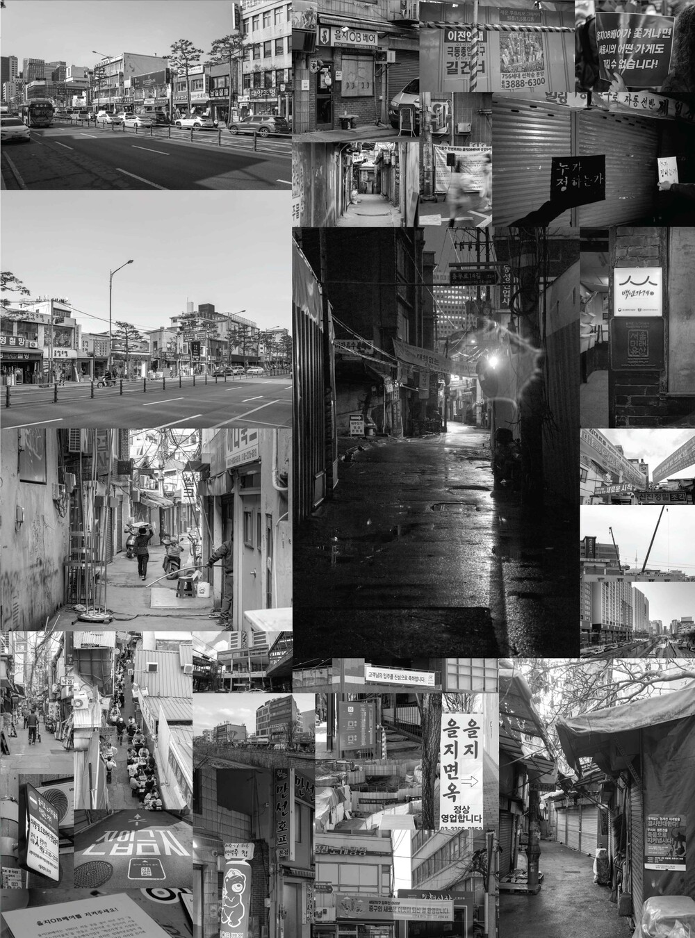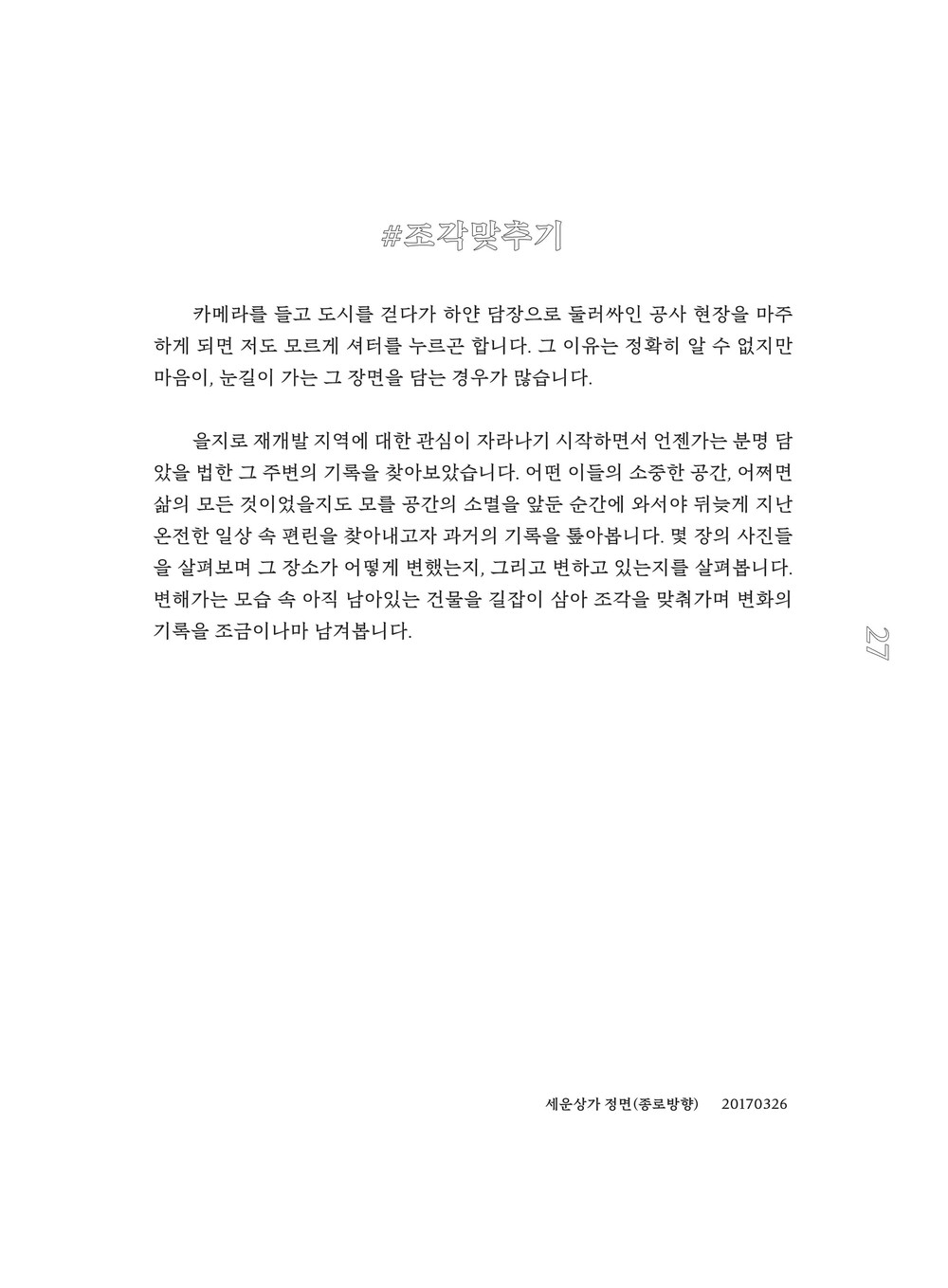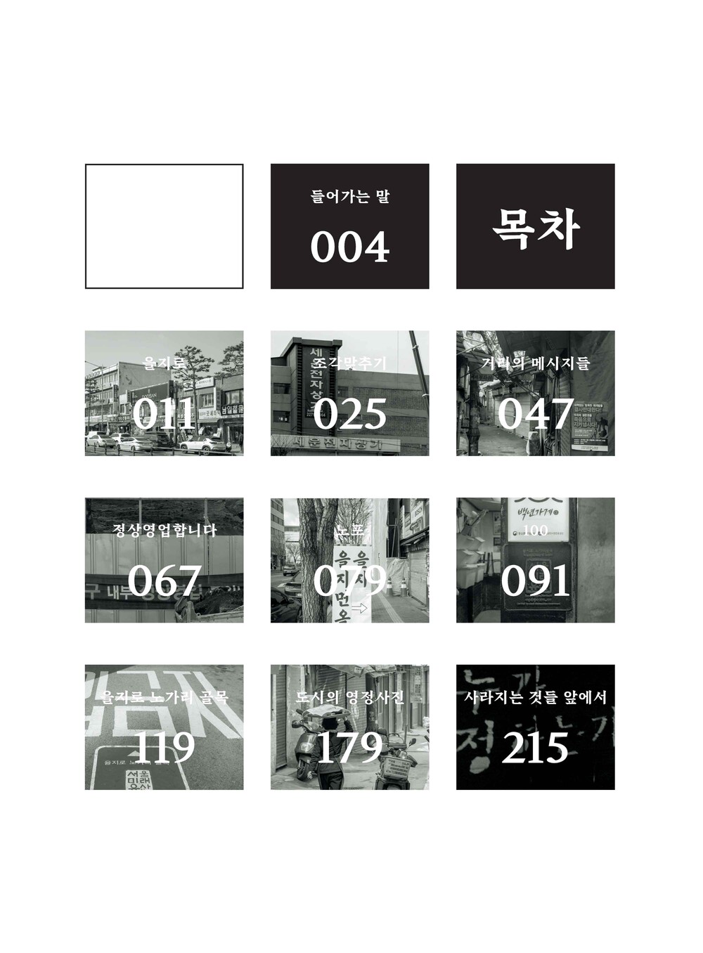 이 책에는 지난 몇 년간 을지로 재개발 지역 일대를 오가며 지켜본 풍경들과 관찰자로서의 생각 단편을 담았습니다. 그리고 그 과정에서 떠오른, 답을 찾지 못한 질문들도 함께 적어두었습니다.