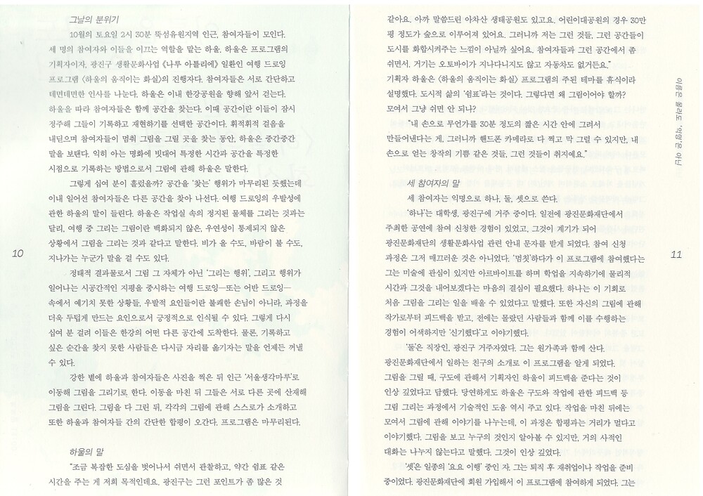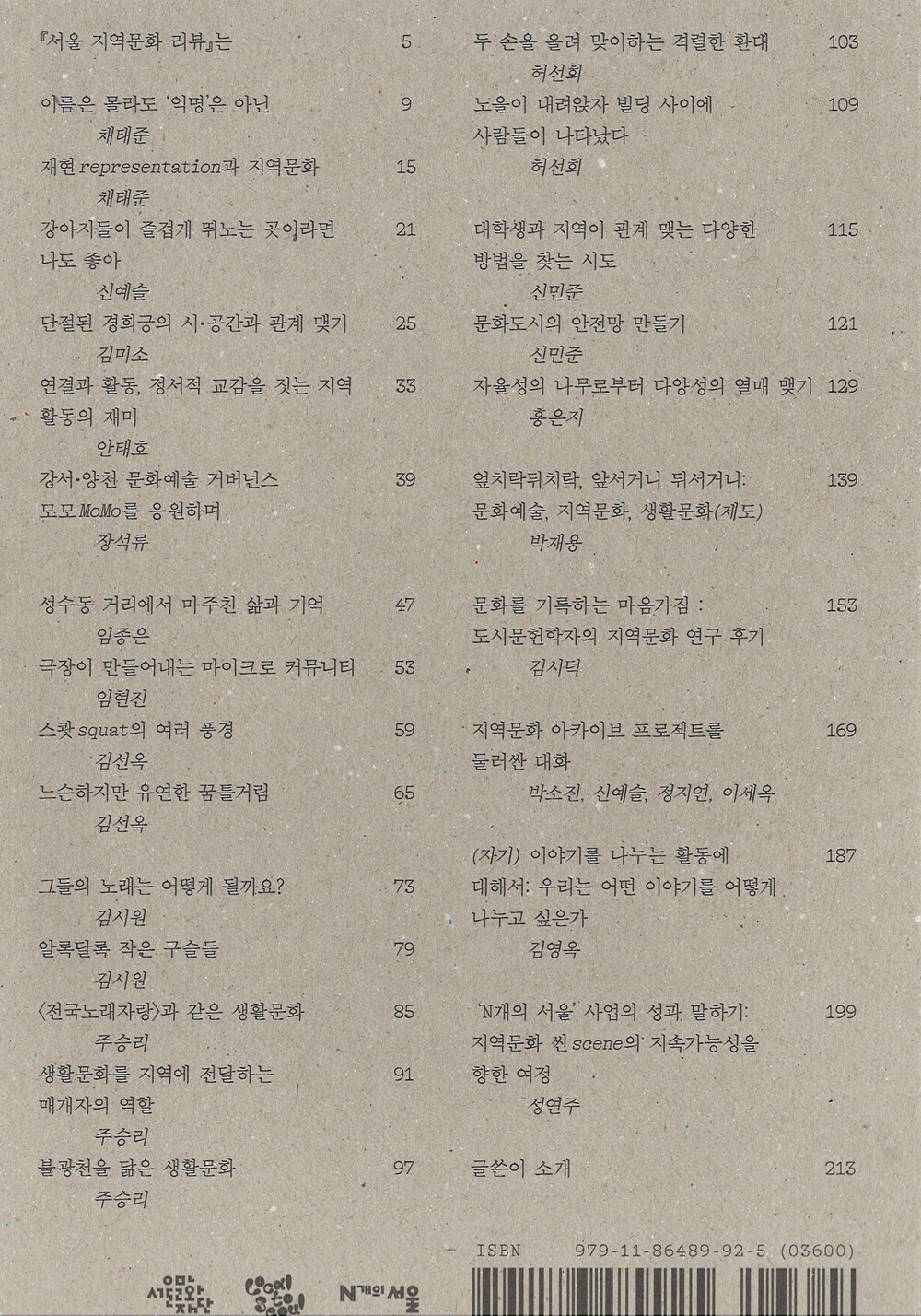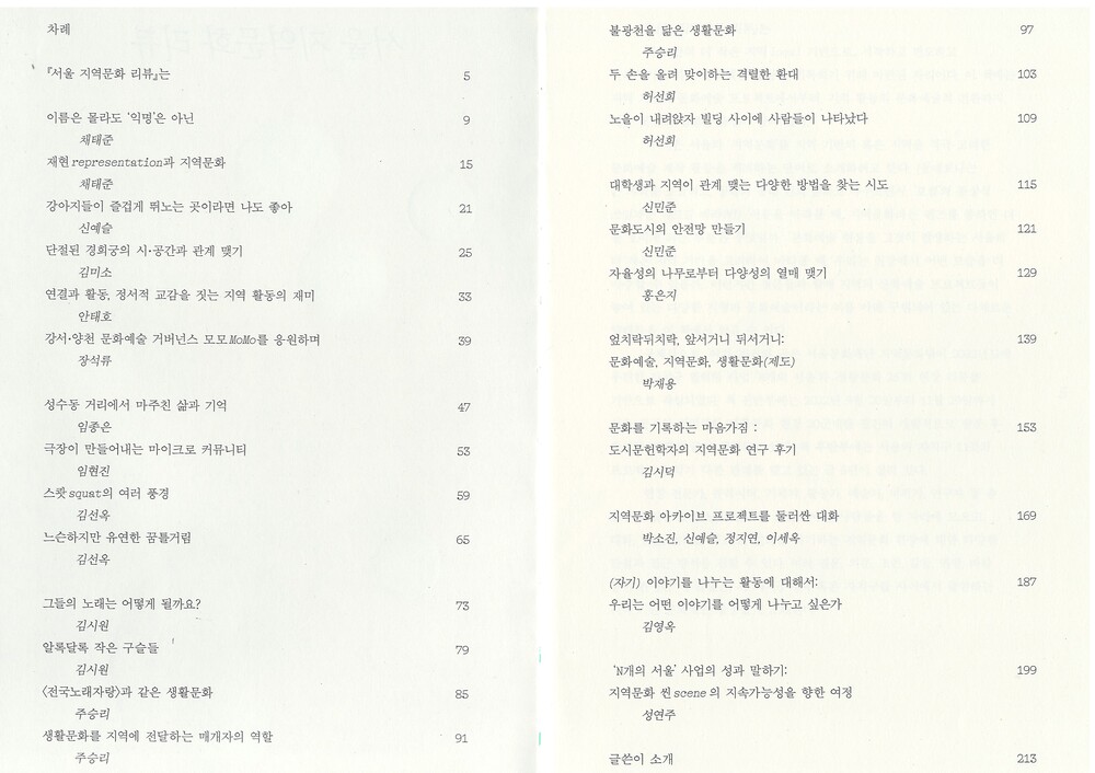 책 전반부에는 2022년 9월 20일부터 11월 29일까지 서울 곳곳의 지역문화/생활문화 현장 20군데를