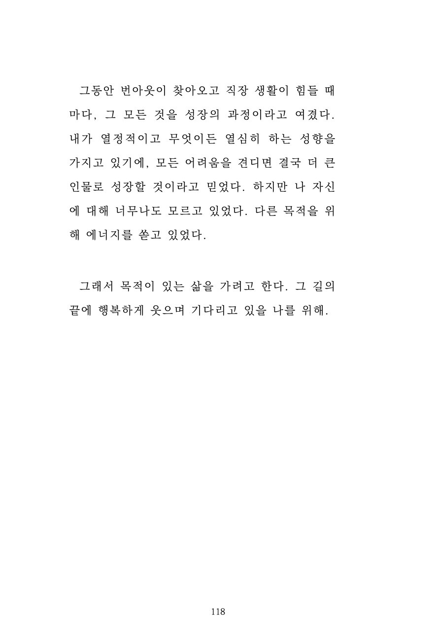 긴 여정을 통해 나만의 길을 찾고, 고독에 대한 긍정적인 마음을 갖게 되다. 그 결과, 진정으로 원하는 가치와 목적을 가진 삶을 찾게 된 후, 모든 것을 접고 인생의 제2막을 시작하게 되다.