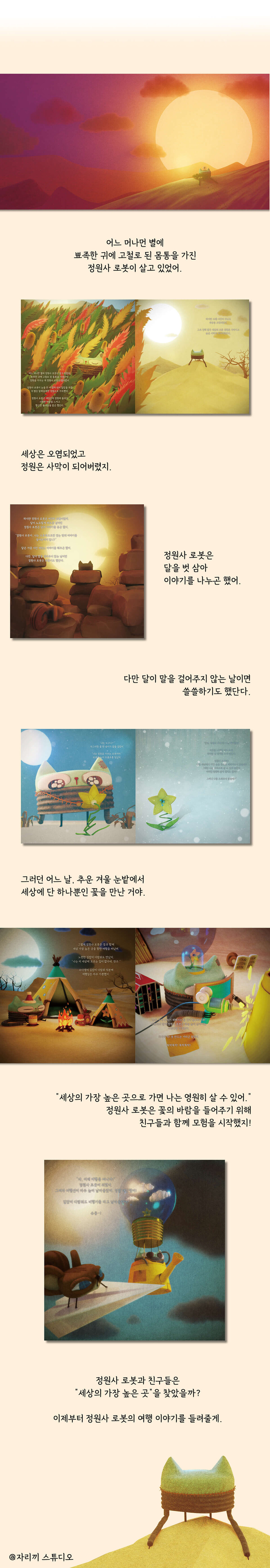 정원사 로봇의 이야기가 궁금하시다면 자리끼 스튜디오의 첫 번째 동화책<정원사 로봇 이야기>의 세계 속으로, 치유의 여정 속으로 들어오세요.