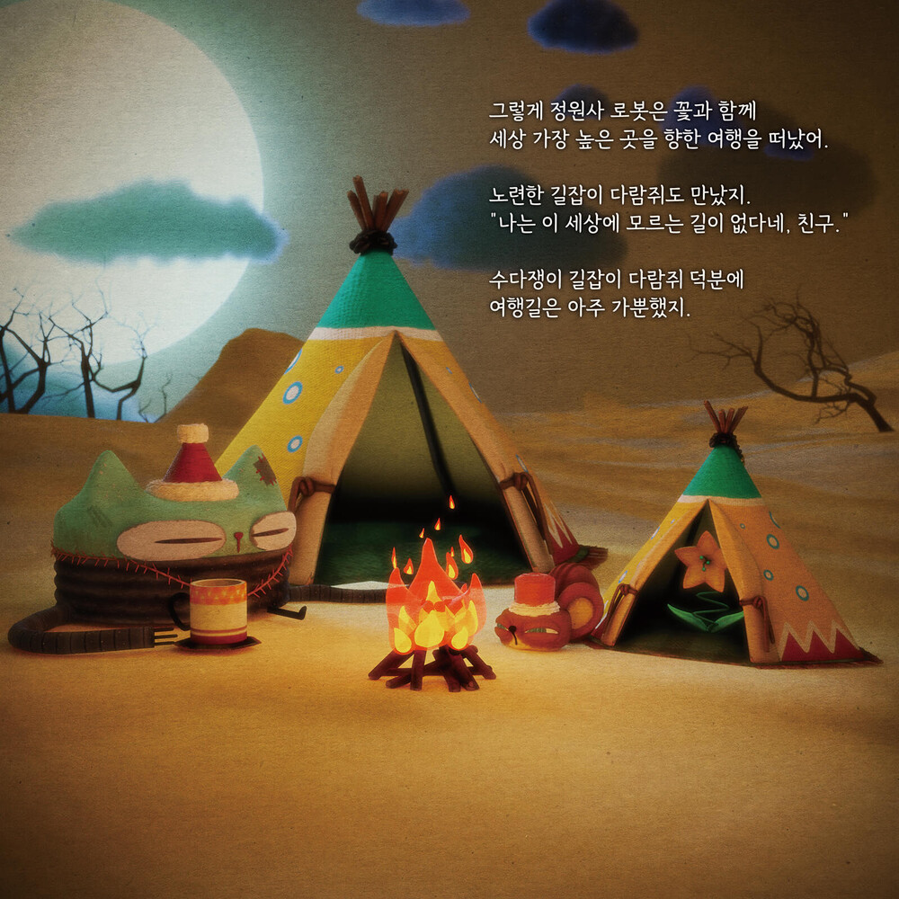 사막이 된 행성을 여행하던 정원사 로봇은 차가운 눈밭에서 꽃 한 송이를 만나게 됩니다.