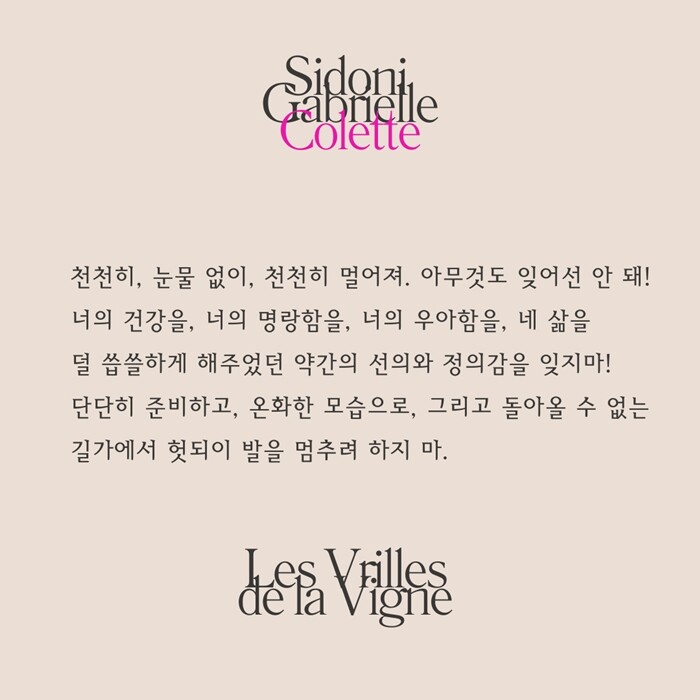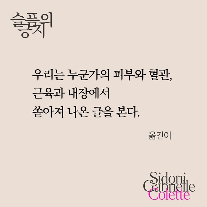 나는 그녀의 펜에서 바람 같은 자유로움, 섬세한 부드러움, 유머러스한 재치, 풍부한 상상력, 엉뚱함이 가득한 호기심, 대상을 대하는 따뜻함 그리고 연약한 듯 보이는 갈대 같은 강함을 발견했다. 고통과 역경에 좌절하지 않고 미래로 나아가는 힘은 그저 강한 것에서만 나오는 것이 아니었다. 비록 고통, 역경, 강함과 같은 것들이 문장 아래에 숨겨져 있더라도. 그래서인지 그녀의 글은 오히려 아름다웠다. 아름답다는 말로는 표현이 부족하기에 아름다움의 의미를 다시 정리하게 만들어 준 이 책으로 많은 분이 콜레트와 사랑에 빠지시길.