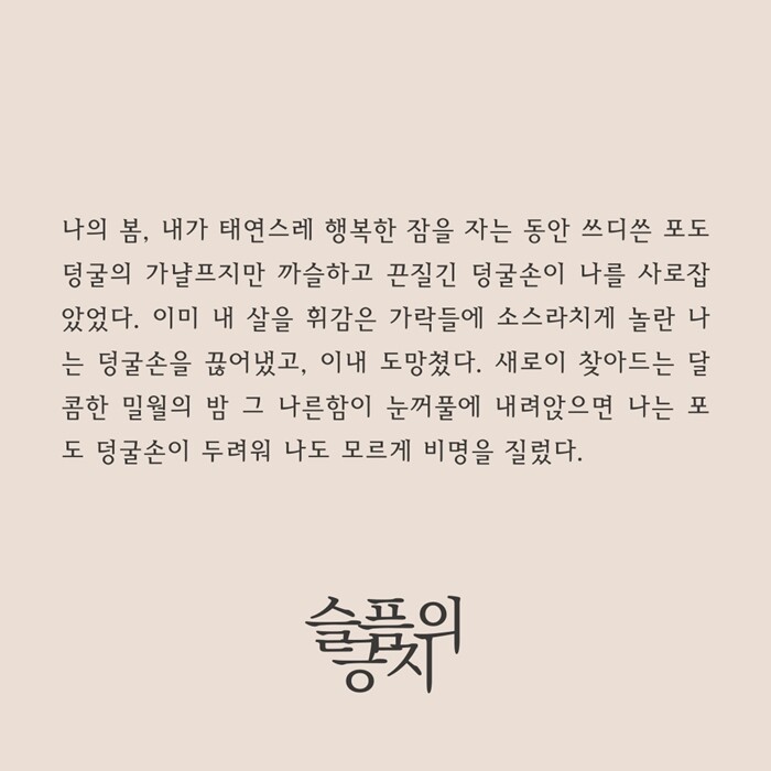 드레스 자락을 물들인 물오른 풀잎을 밟으며 마냥 웃고 떠들었어. 너의 고요한 쾌락은 내 광기를 바라보는 것이었지. 내가 찔레꽃으로 손을 뻗을 때, 너도 알지, 그 탐스러운 들장미 말이야, 내 눈앞에서 너의 손이 가지를 꺾어 발톱 같은 짧고 붉은 가시들을 하나씩 하나씩 떼어내…. 넌 내게 발톱 없는 꽃들을 주었지…. 넌 내게 발톱 없는 꽃들을 주었어…, 내가 가쁜 숨을 돌리고 쉴 수 있게 페르시안 라일락의 영근 수수 그늘로 나를 이끌었지…. 넌 내게 화단의 수레국화를 한 아름 따 주었어, 솜털 같은 꽃술에서 살구 향이 나는 매혹적인 꽃…. 넌 작은 병에 든 커스터드 크림을 주었고 허기진 내 손이 허겁지겁 먹는 모습에 웃음을 터트렸지…. 넌 내게 아주 잘 구워진 황금빛 빵을 주었어, 그리고 내 머리 위에 윙윙거리는 벌을 쫓으려 햇살 아래 너의 창백한 손이 또다시 들려지는 것이 보여…. 구름이 길고 느리게 흘러가는 한낮의 끝에서 내 어깨를 외투로 감쌀 때, 이루 말할 수 없는 기쁨에 취해 소름이 돋았어, 봄날 행복한 짐승들의 천진한 기쁨에 젖어…. 넌 말했지…. “이리 와, 그만 돌아가자”