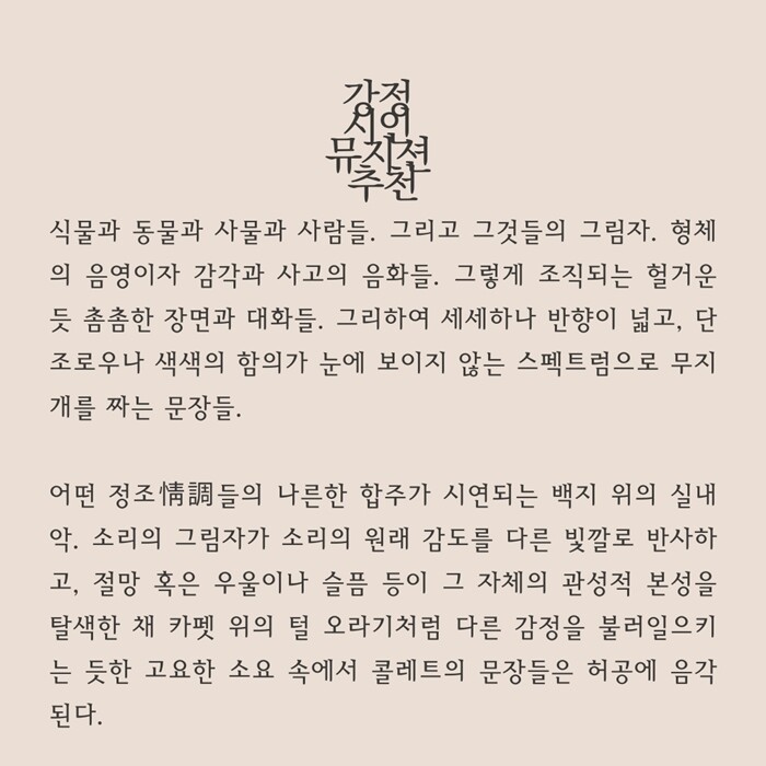 어떤 정조情調들의 나른한 합주가 시연되는 백지 위의 실내악. 소리의 그림자가 소리의 원래 감도를 다른 빛깔로 반사하고, 절망 혹은 우울이나 슬픔 등이 그 자체의 관성적 본성을 탈색한 채 카펫 위의 털 오라기처럼 다른 감정을 불러일으키는 듯한 고요한 소요 속에서 콜레트의 문장들은 허공에 음각된다.