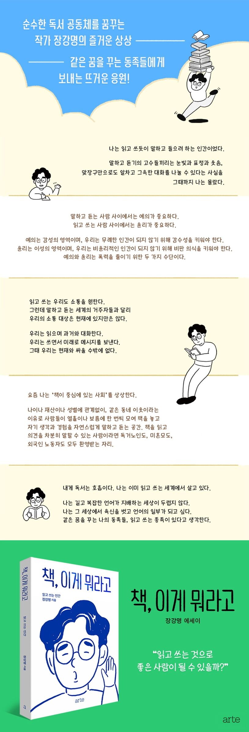 팟캐스트 〈책, 이게 뭐라고?!〉를 진행하면서 장강명 작가가 꼽은 즐거움이자 특권은 바로 다양한 작가들을 직접 만나 고민과 아이디어를 나눠볼 수 있다는 점이었다. 전에 없던 새로운 길을 개척한 작가들부터 동지 의식을 느꼈던 소설가들, 특별히 더 큰 응원의 목소리를 보태고 싶었던 르포르타주 작가들과 웹소설 작가들까지 다양한 읽고 쓰는 사람들을 만났다. 장강명은 그들과의 대화를 통해 자신의 글에 대해 조금 더 뾰족하게 질문의 날을 세워 고민하게 된다. 출판 기획에 대해 생각해보기도 하고, 장강명이 추구하는 르포르타주는 어떤 방식인지도 생각해본다. 트렌디하고 가벼운 글이나 책을 손에 들었을 때는 동시대 독자의 마음을 사로잡는 일과 미래의 평가 사이에서 떠오른 갈등과 고민을 솔직하게 털어놓기도 한다.