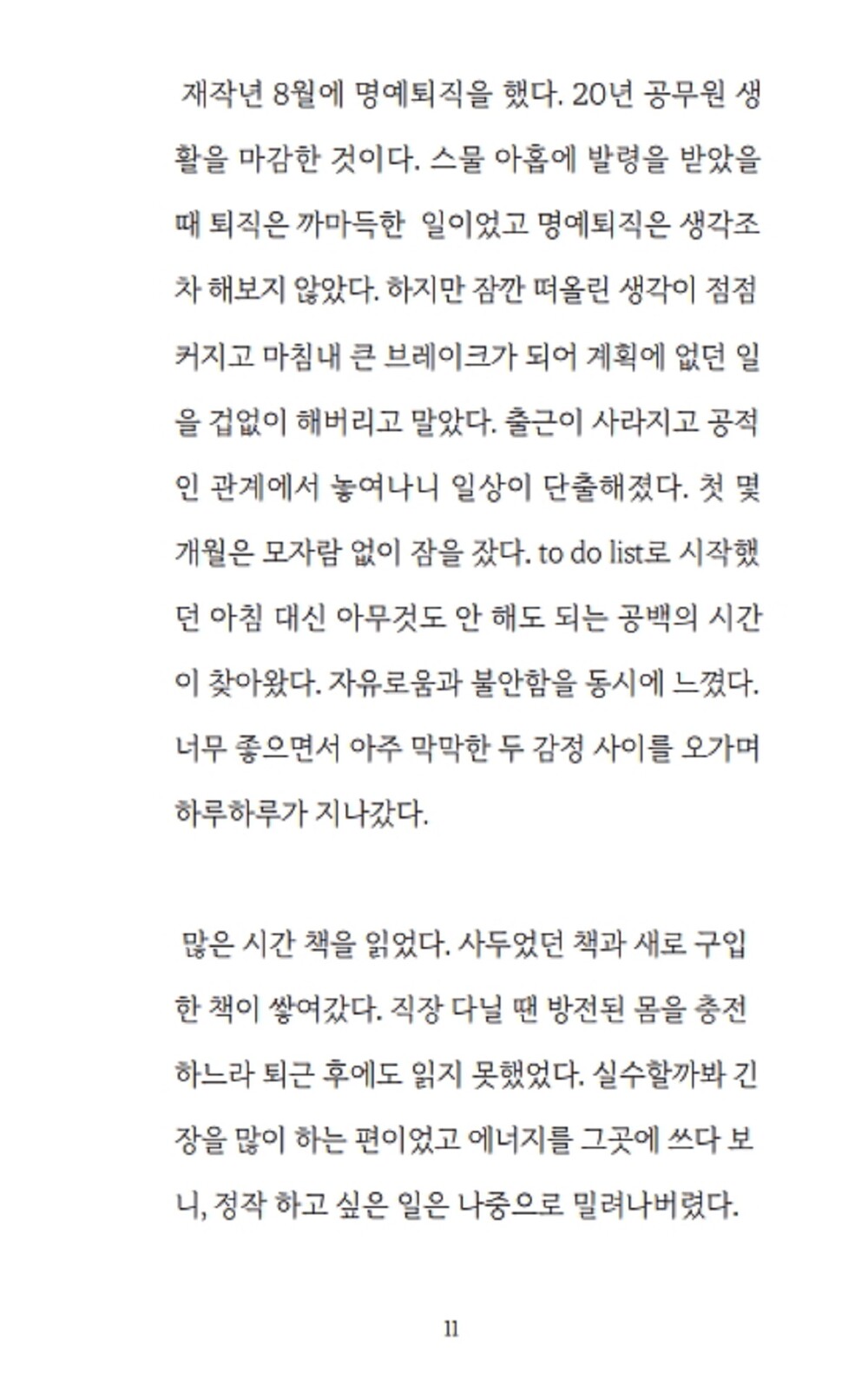 퇴직 이년차에 접어든 글쓴이가 이십년간 지속했던 삶을 돌아보며 현재의 의미를 발견하는 내용을 담은 에세이입니다.