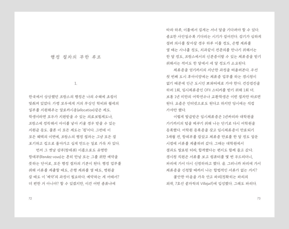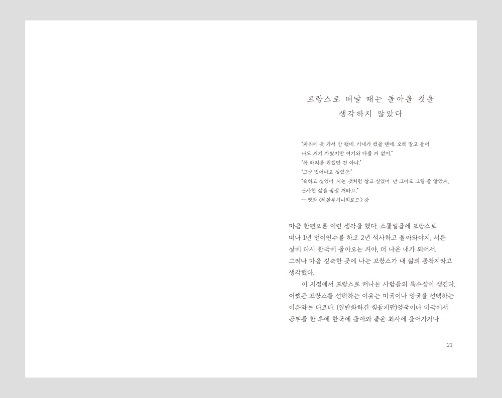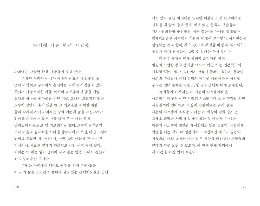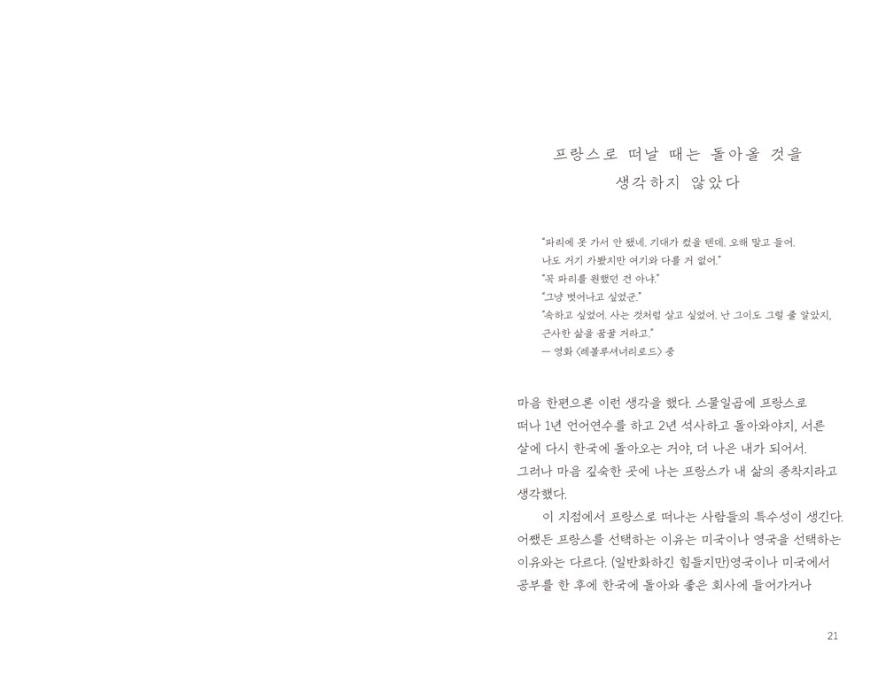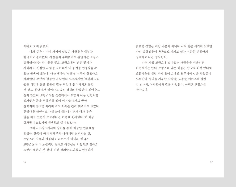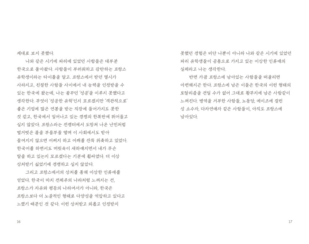 그러나 프랑스를 떠나온 후, 나는 이렇게 좋지 않은 시선으로만 보았던 한국 사회를 새로운 시선으로 본다. 우리에게는 민폐를 끼치지 말아야겠다고 생각하는 마음과 자신의 일을 잘하고자 하는 책임감, 어떤 일이라도 해결책을 찾아내고자 하는 악바리 근성이 있다. 함께 고민하고 잘못된 것에 함께 분노를 표출할 줄 안다.