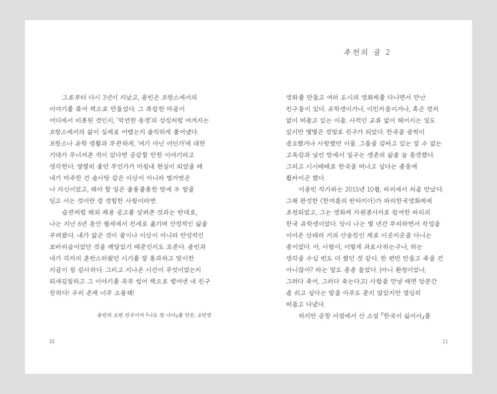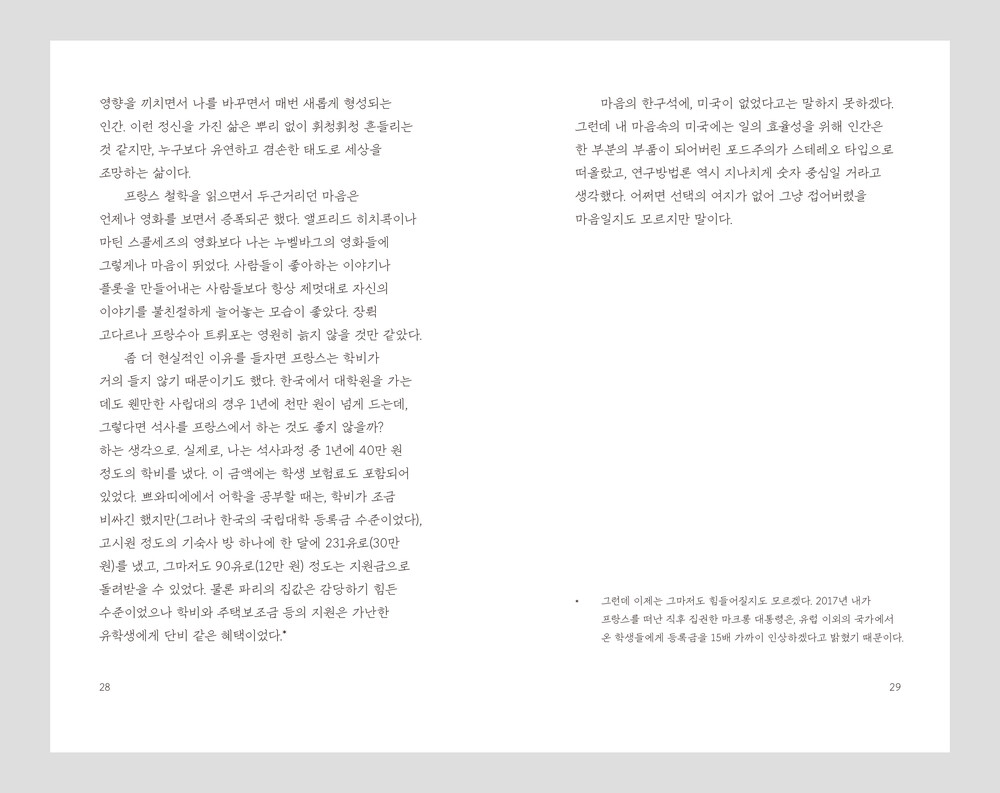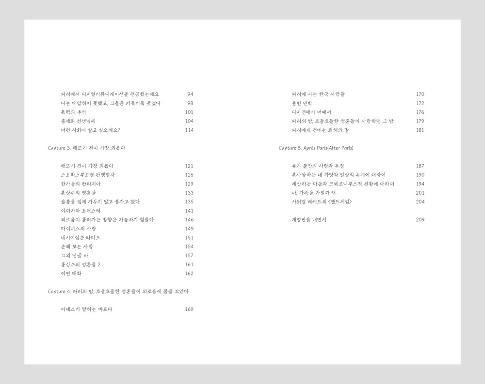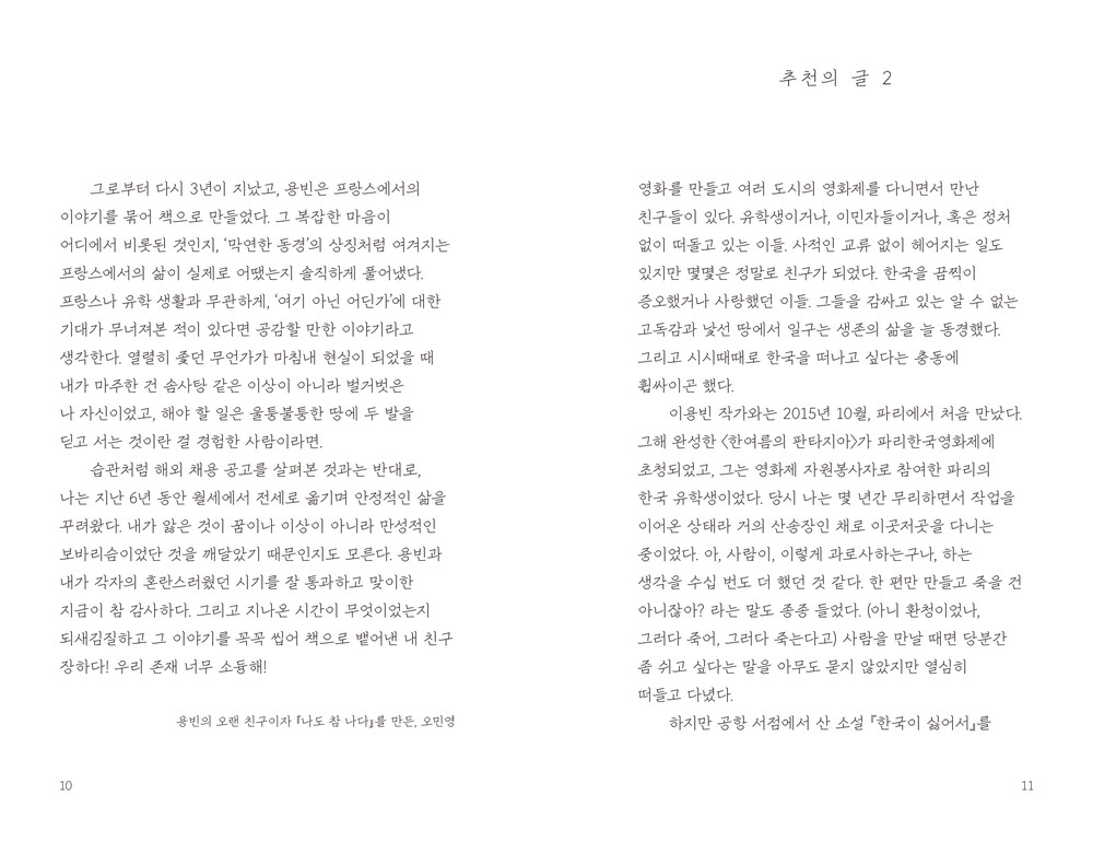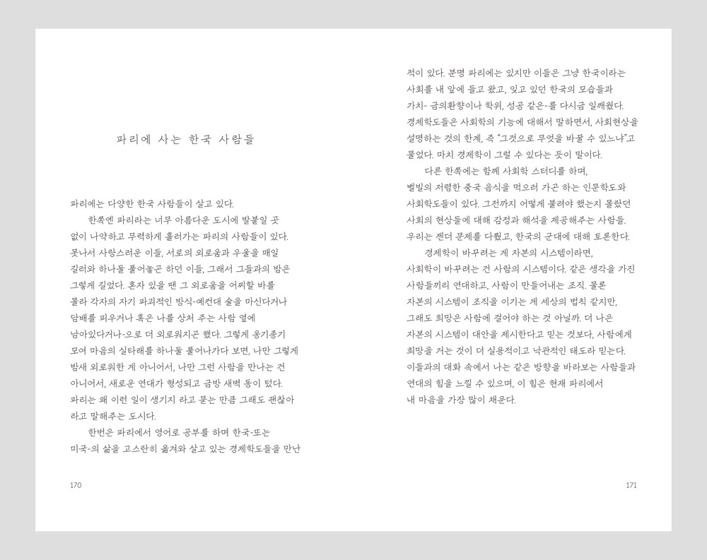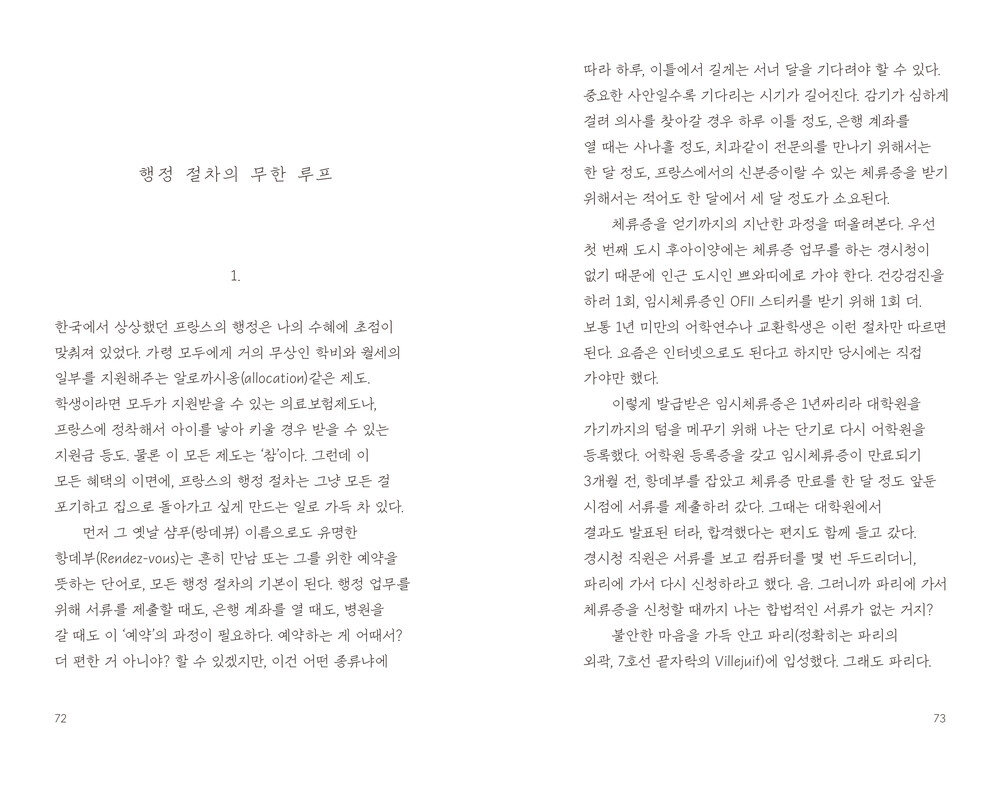 그러나 프랑스를 떠나온 후, 나는 이렇게 좋지 않은 시선으로만 보았던 한국 사회를 새로운 시선으로 본다. 우리에게는 민폐를 끼치지 말아야겠다고 생각하는 마음과 자신의 일을 잘하고자 하는 책임감, 어떤 일이라도 해결책을 찾아내고자 하는 악바리 근성이 있다. 함께 고민하고 잘못된 것에 함께 분노를 표출할 줄 안다.