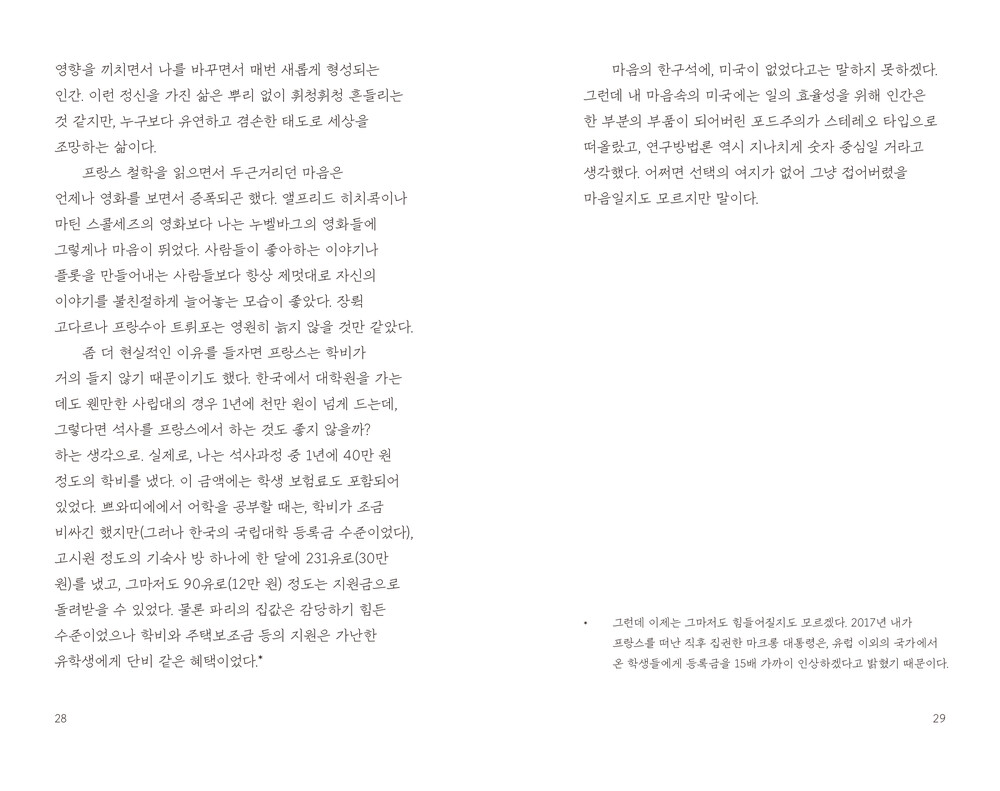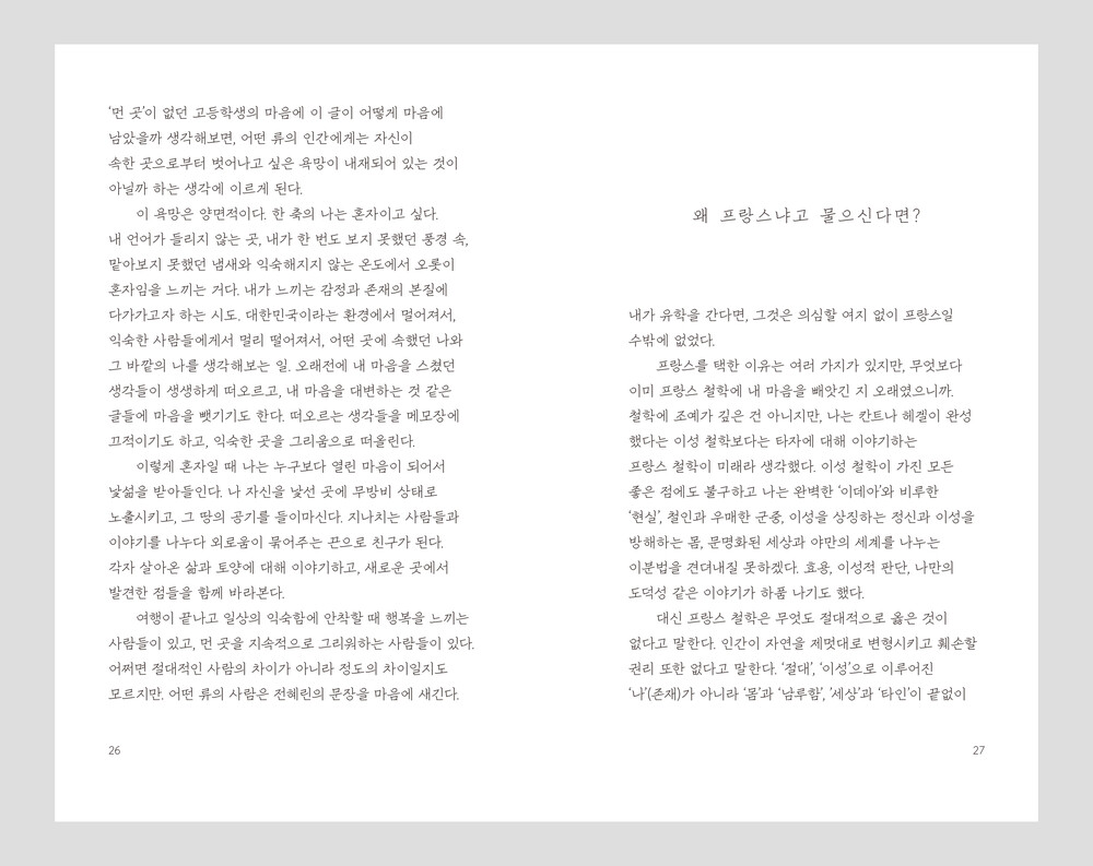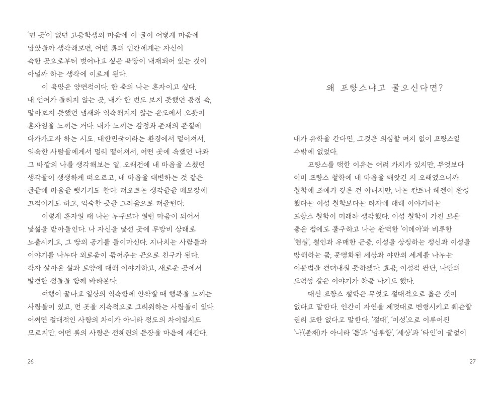 프랑스를 택한 이유는 여러 가지가 있지만, 무엇보다 이미 프랑스 철학에 내 마음을 빼앗긴 지 오래였으니까. 철학에 조예가 깊은 건 아니지만, 나는 칸트나 헤겔이 완성했다는 이성 철학보다는 타자에 대해 이야기하는 프랑스 철학이 미래라 생각했다.
