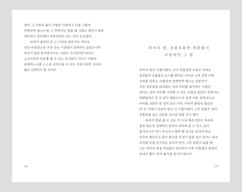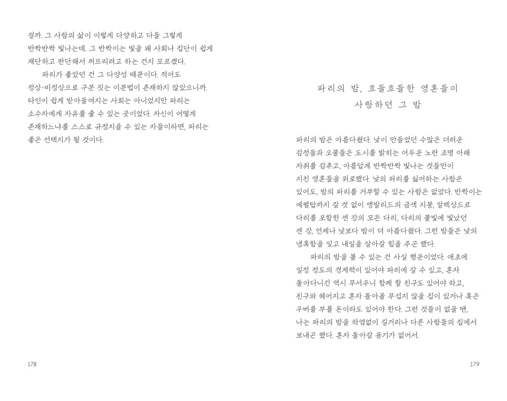한쪽엔 파리라는 너무 아름다운 도시에 발붙일 곳 없이 나약하고 무력하게 흘러가는 파리의 사람들이 있다. 못나서 사랑스러운 이들, 서로의 외로움과 우울을 매일 길러와 하나둘 풀어놓곤 하던 이들, 그래서 그들과의 밤은 그렇게 길었다.