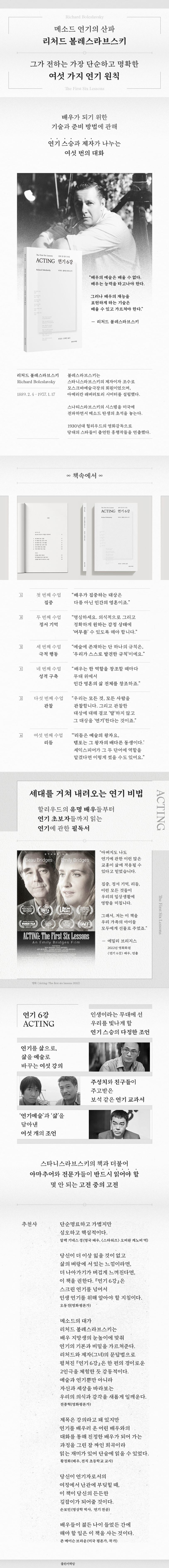 볼레스라브스키는 오랜 경험과 심층적인 연구를 바탕으로 ‘연기’의 핵심을 다룬 책을 남겼다. 그는 연기에 대한 가장 기본적이면서 중요한 개념들을 친절하고도 상세하게 가르쳐 준다. 당신이 연기자로서의 여정에서 난관에 부딪힐 때, 이 책이 당신의 든든한 길잡이가 되어줄 것이다.