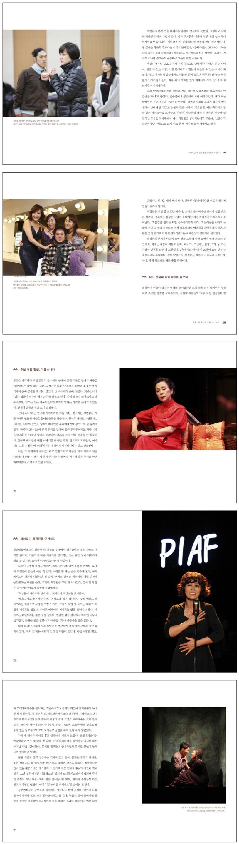 “평범한 배우는 많습니다. 평범한 배우는 자신의 최대 한계점이 어디인지 모르는 사람이에요. 특별한 배우는 자기 한계점이 어디인지 알고 그 경계를 계속 늘려가는 사람입니다. 저는 여러분이 120회 공연을 혼자서 해냈을 때 특별한 배우가 될 거라고 생각합니다. 장기공연에 대한 두려움에서 빨리 벗어나야 특별한 배우가 됩니다. 저는 <아이다>가 여러분의 대표작 중 하나가 되기를 바랍니다.” (91쪽_아이다_수준 높은 명품 뮤지컬에 도전하다)