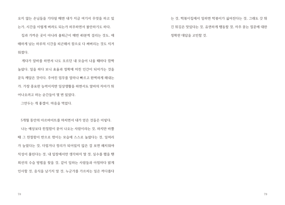 떡볶이집 아르바이트와 서핑샵 아르바이트, 운전면허 취득. 처음을 겪었던 과정을 20대 초반의 눈으로 생생히 담았다.