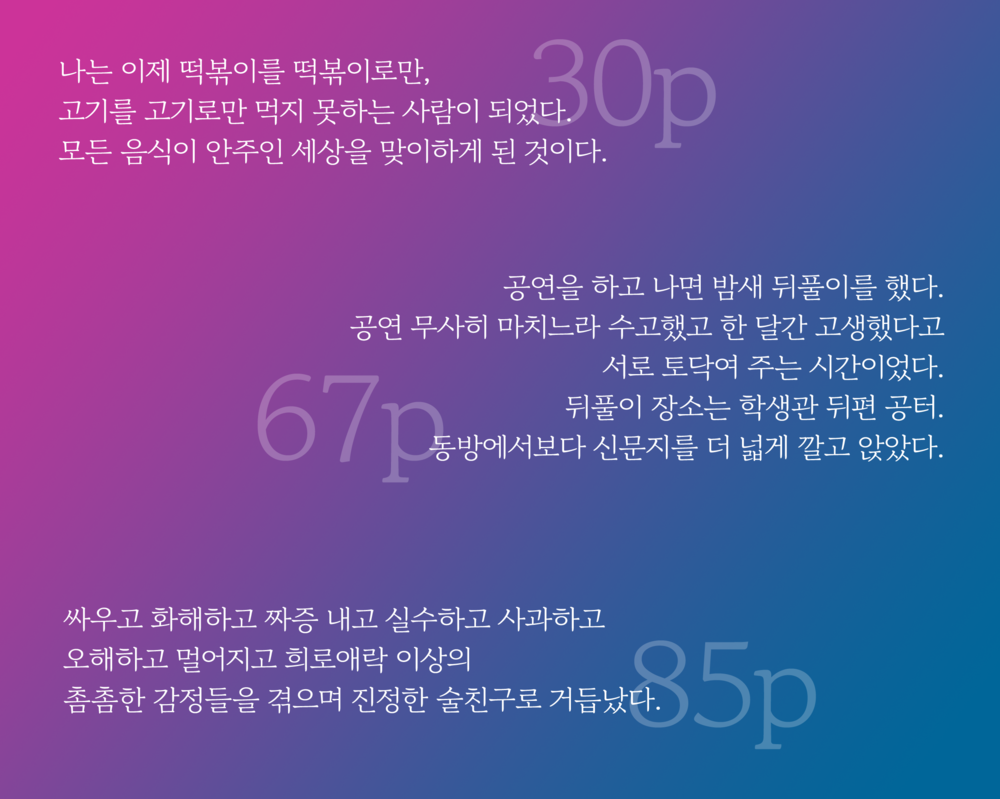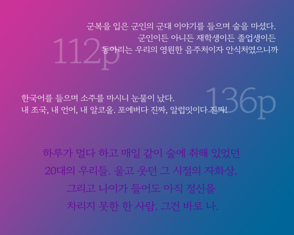 술에 눈을 뜨기 시작한 대학 시절을 중점적으로, 술 권하는 회사 생활과 자영업의 삶까지 술잔에 녹아있는 인생사를 엿볼 수 있을 것이다.