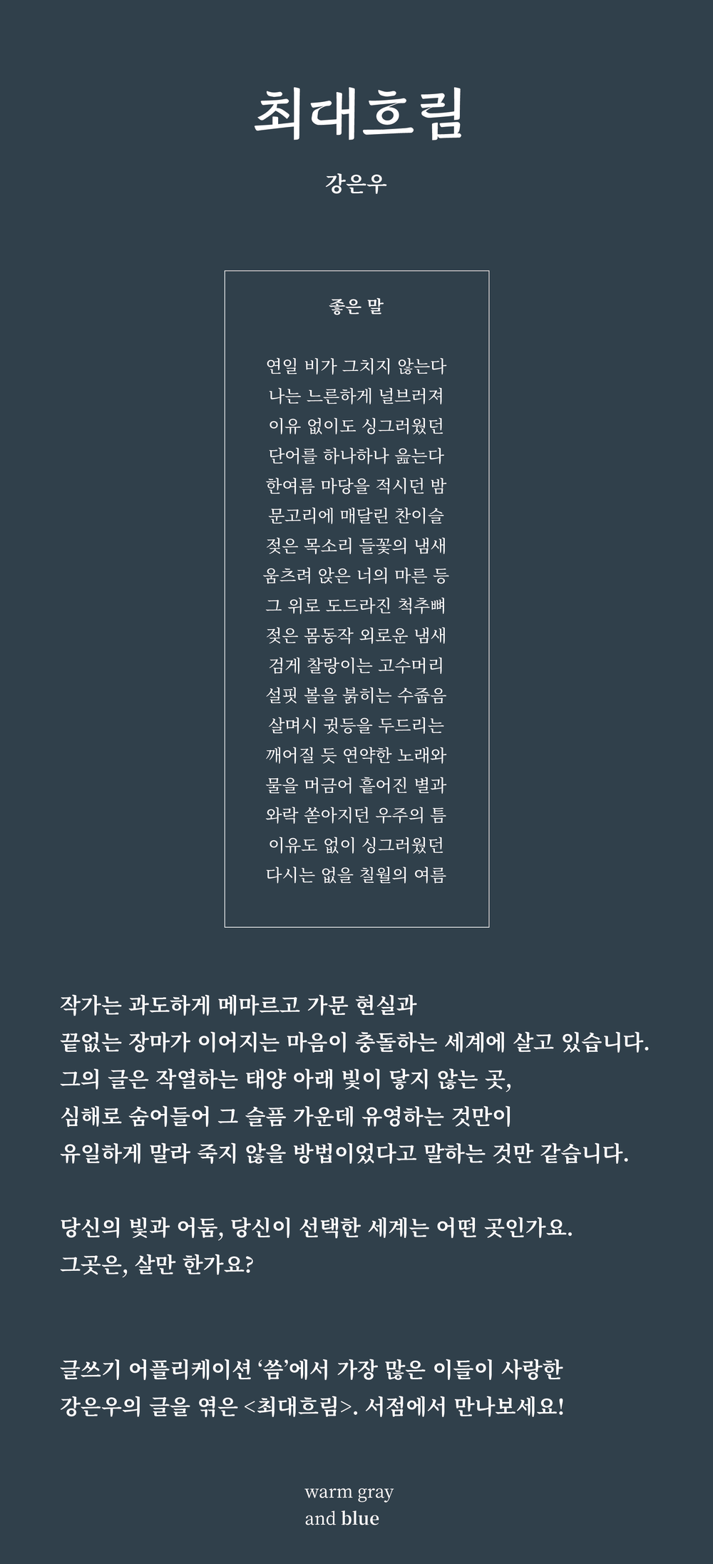 <최대흐림>은 글쓰기 어플리케이션 ‘씀’에서 강은우의 글 100편을 엮은 책입니다.