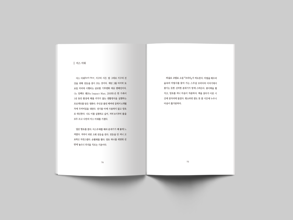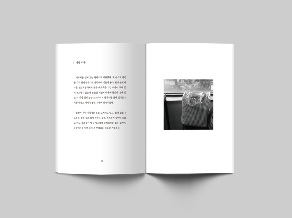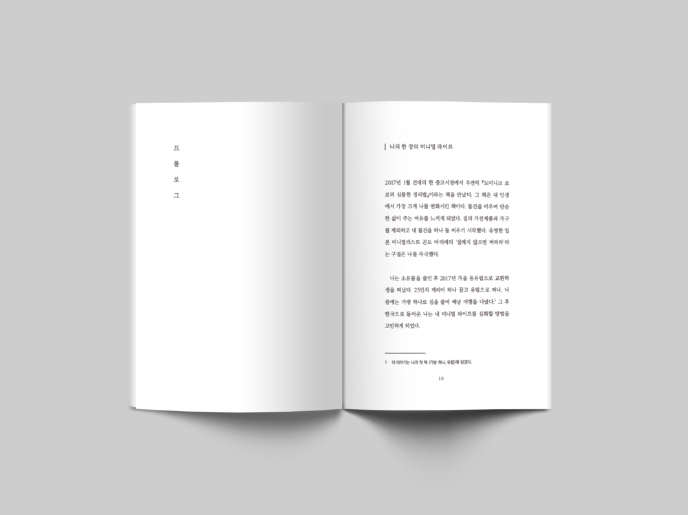 텀블러, 손수건, 대나무 칫솔 등 친환경 물건 실천에서 시작하여 미니멀 라이프를 위한 비움, 간소한 생활, 채식, 더 나아가 환경을 위한 고민, 개인의 실천을 넘어선 연대까지. 미니멀 라이프와 환경에 대한 가치관이 담긴 에세이입니다.