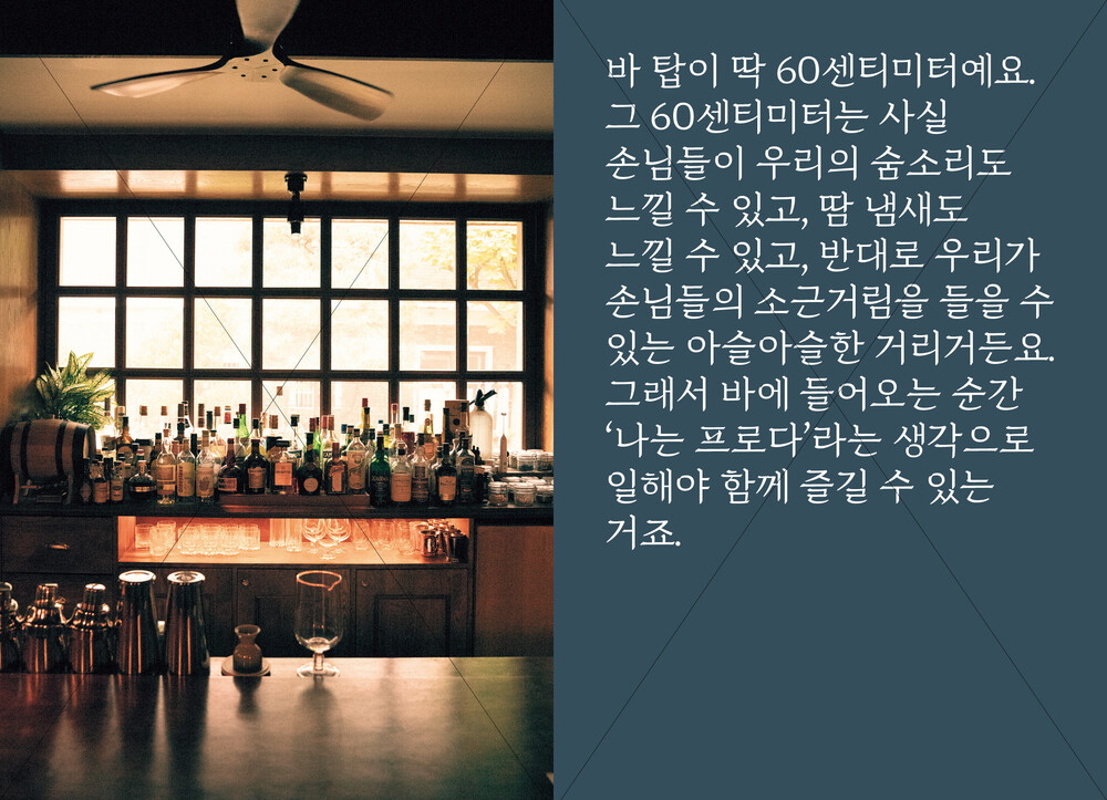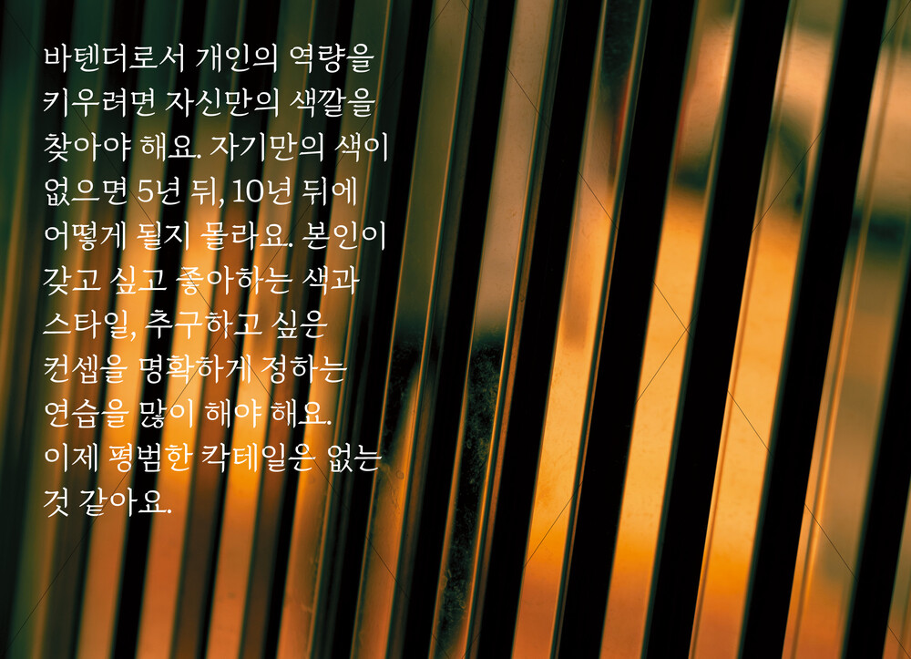 그래서 바에 들어오는 순간 ‘나는 프로다’라는 생각으로 일해야 함께 즐길 수 있는 거죠.”