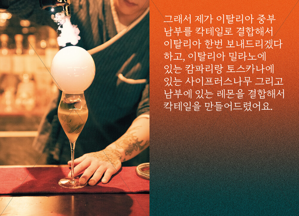 이탈리아 밀라노에 있는 캄파리랑 토스카나에 있는 사이프러스나무 그리고 남부에 있는 레몬을 결합해서 칵테일을 만들어드렸어요.