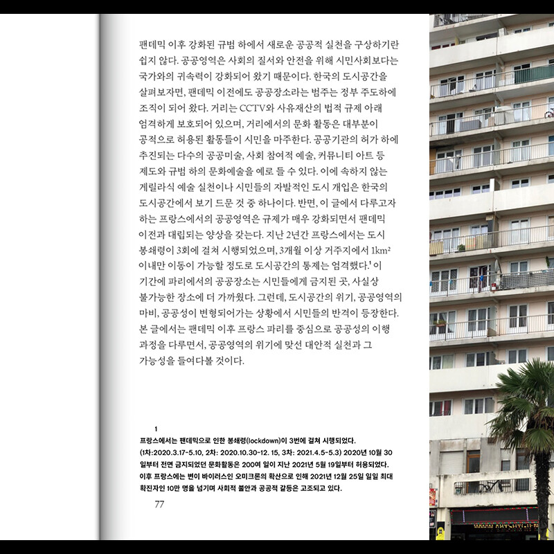 이 책은 서울과 파리 사이에서 결성된 콜렉티브 ‘리트레이싱 뷰로’(심소미, 줄리앙 코와네)가 팬데믹 이후 위태로워진 도시공간과 공공영역에 대한 질문을 바탕으로, 지난 2년 간 프랑스 도시공간을 중심으로 리서치한 내용을 담고 있다.