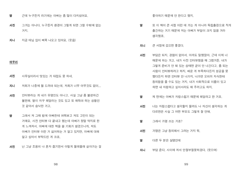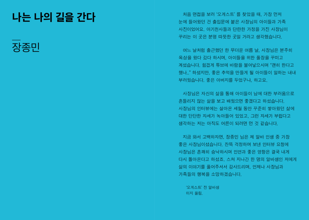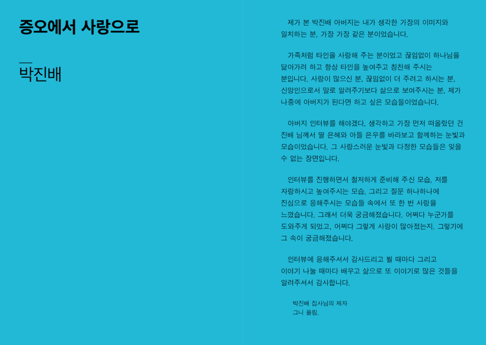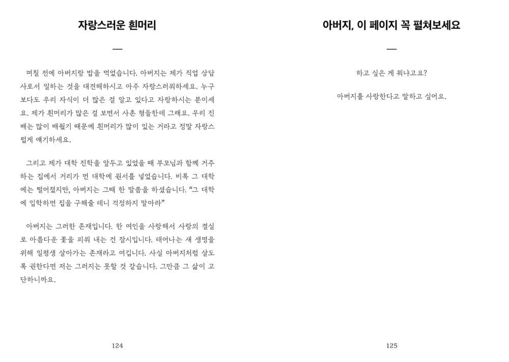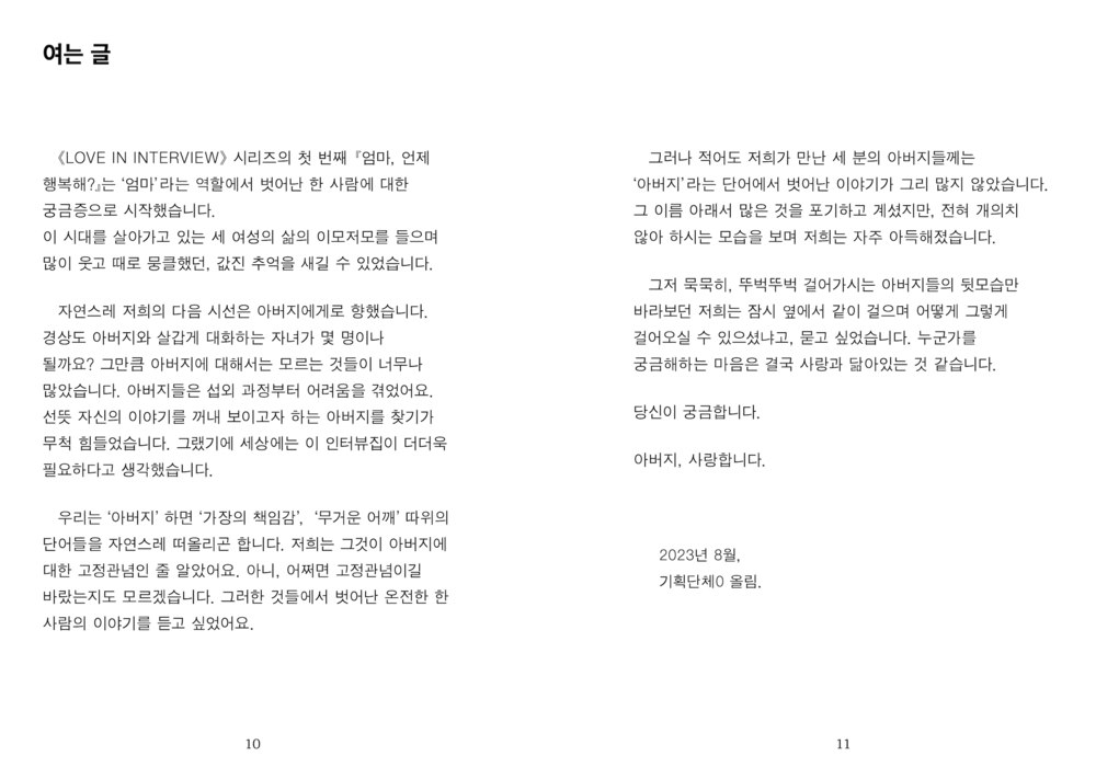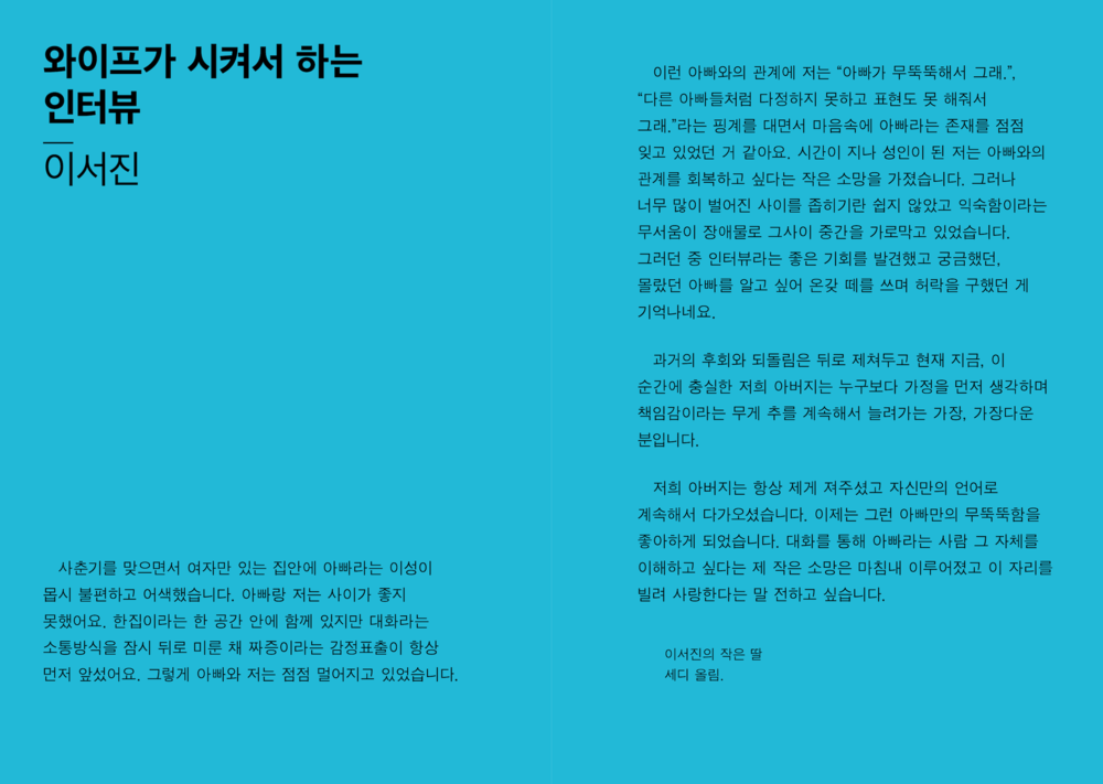 “그러나 적어도 저희가 만난 세 분의 아버지들께는 ‘아버지’라는 단어에서 벗어난 이야기가 그리 많지 않았습니다. 그 이름 아래서 많은 것을 포기하고 계셨지만, 전혀 개의치 않아 하시는 모습을 보며 저희는 자주 아득해졌습니다.”