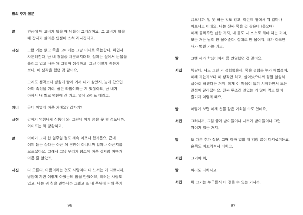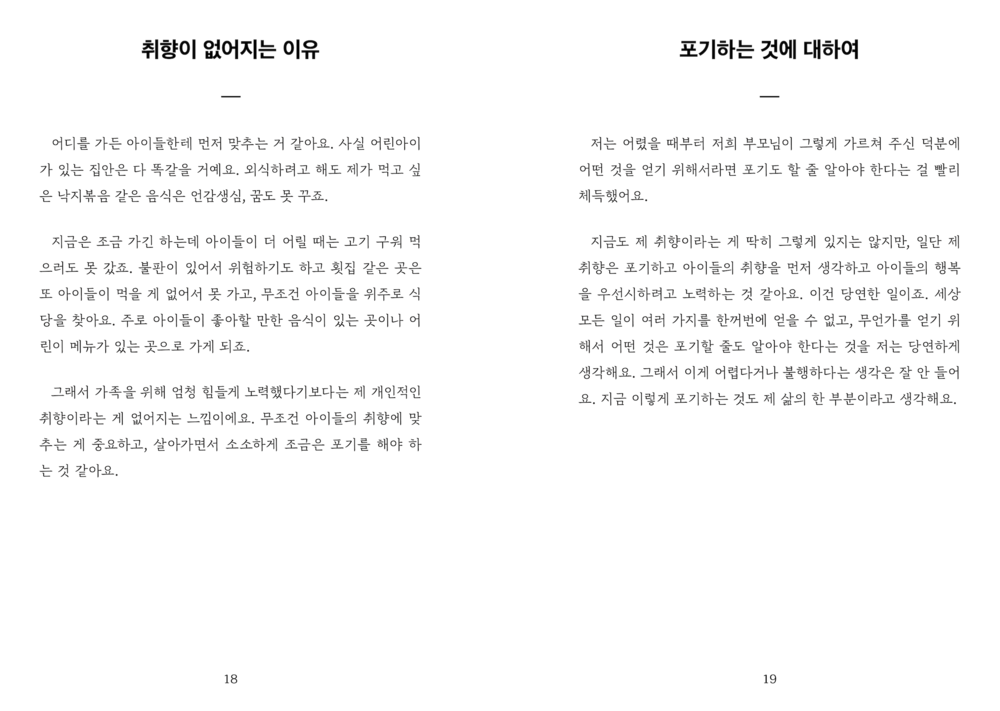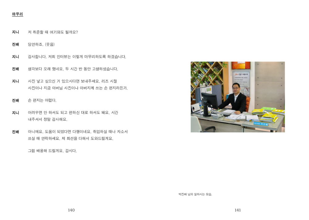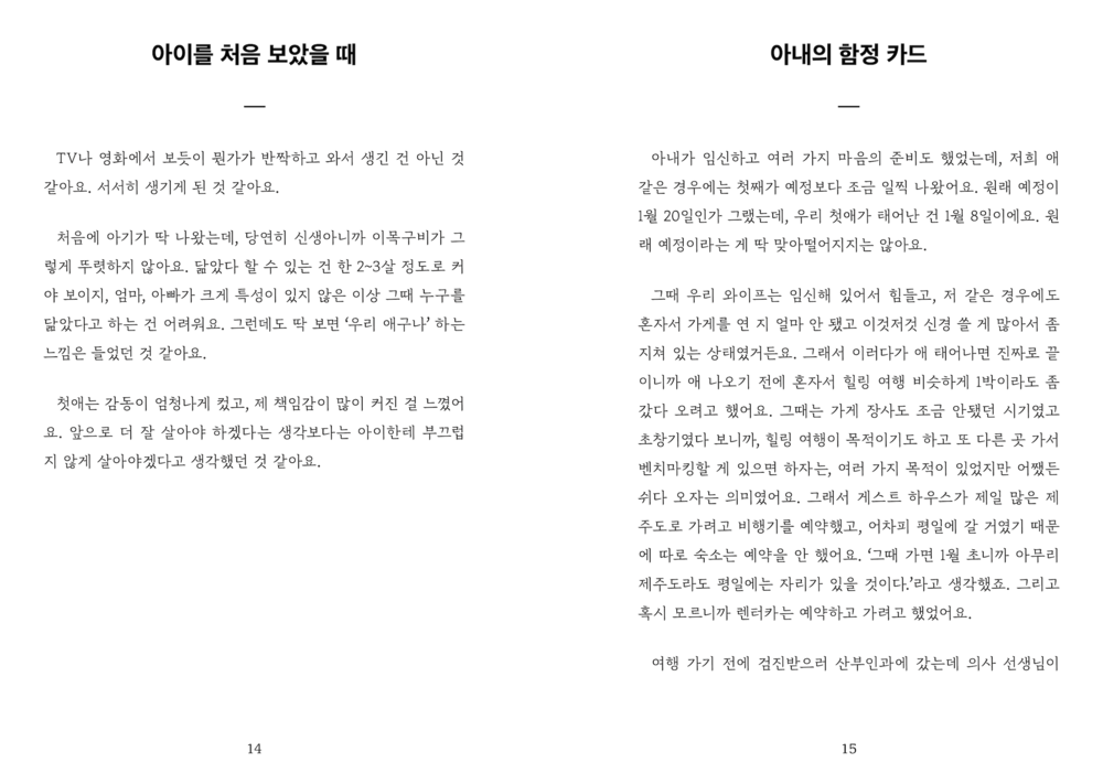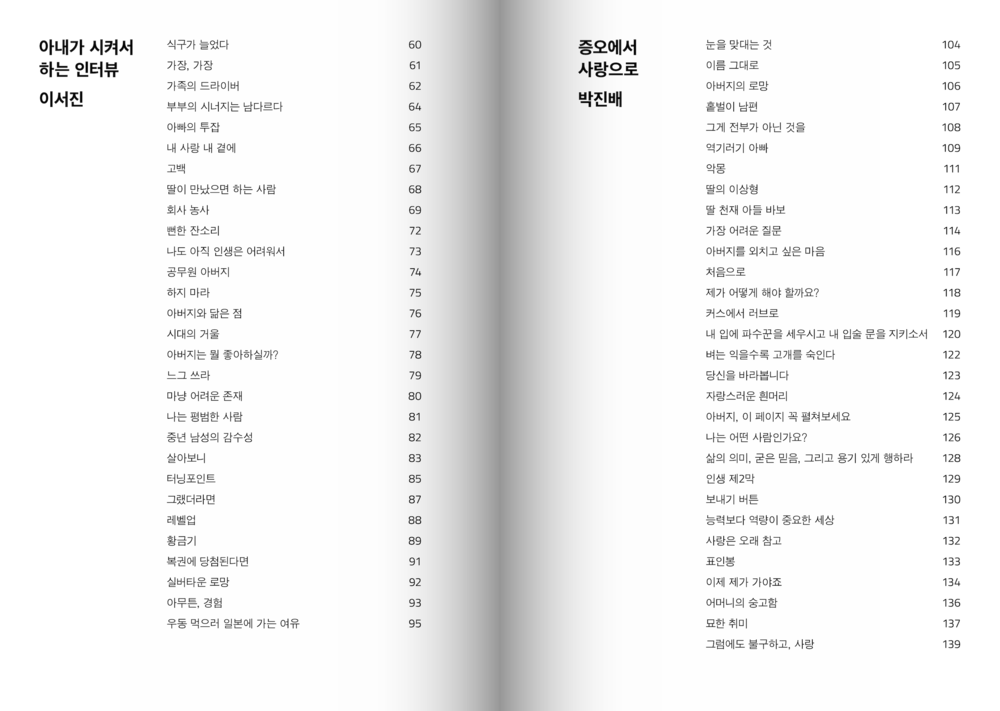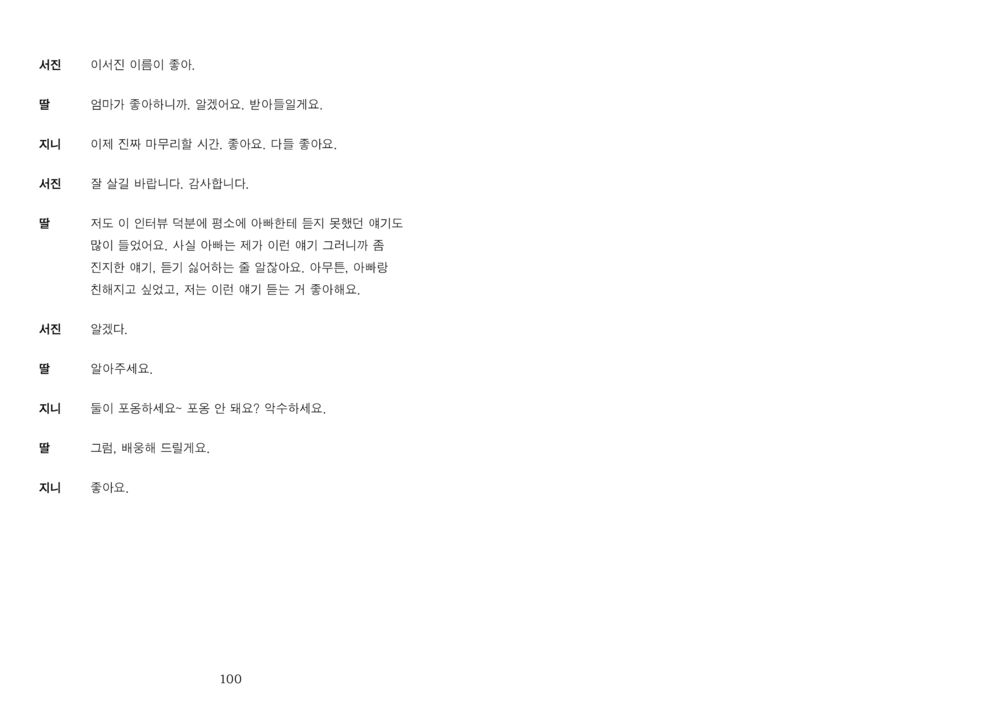 “그러나 적어도 저희가 만난 세 분의 아버지들께는 ‘아버지’라는 단어에서 벗어난 이야기가 그리 많지 않았습니다. 그 이름 아래서 많은 것을 포기하고 계셨지만, 전혀 개의치 않아 하시는 모습을 보며 저희는 자주 아득해졌습니다.”