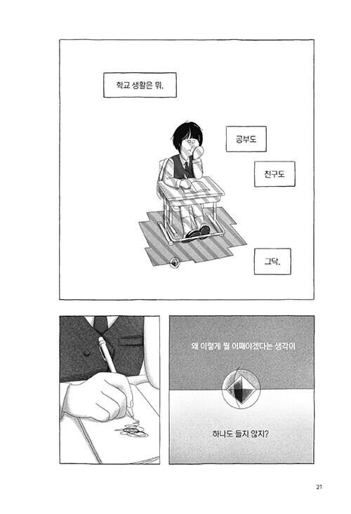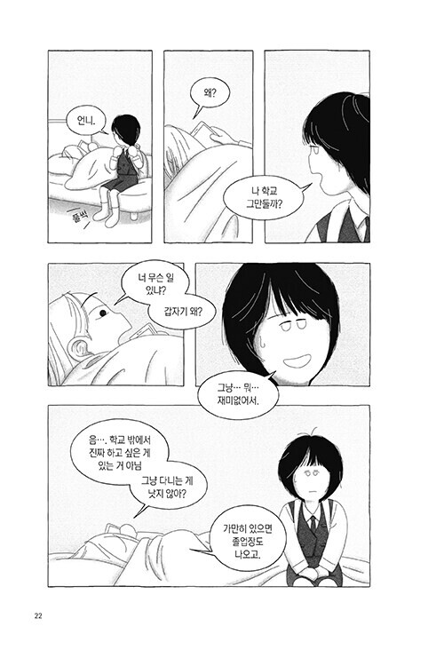 ‘무니’는 학교에서 의미를 찾을 수 없어 학교를 그만둘까 고민합니다.