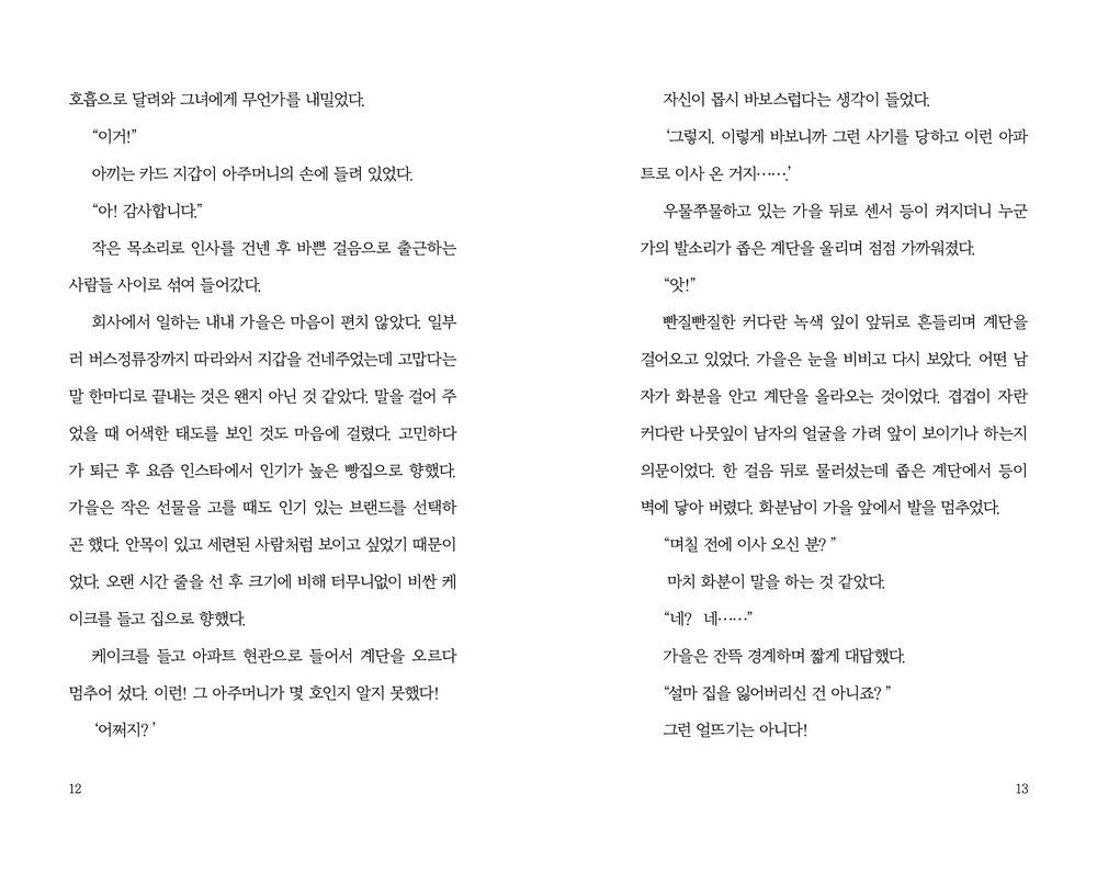 305호의 품에 안긴 갈색 강아지는 꼬리를 마구 흔들며 얼굴을 핥아댔다. 84p