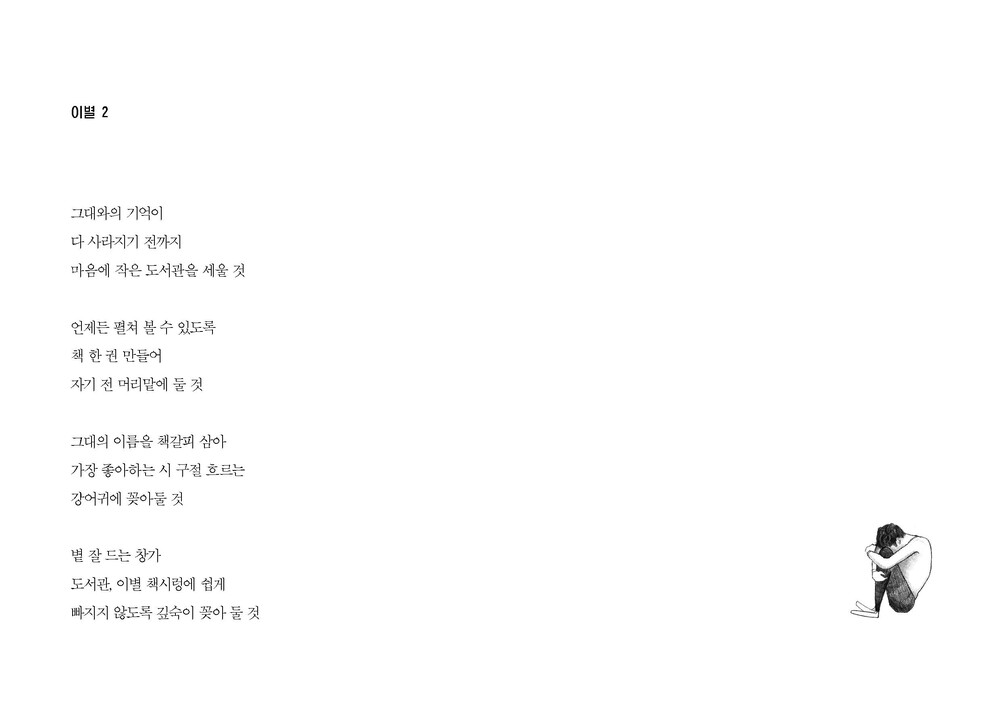 이별의 도서관 이별에 대한 시를 모았습니다. 출간 후 입소문만으로, 1주일간 100권 이상의 판매고를 올린 시월세집 첫 번째 권, <이별의 도서관>은 다양한 이별의 단면들을 21편의 시로 담아내고 있습니다.